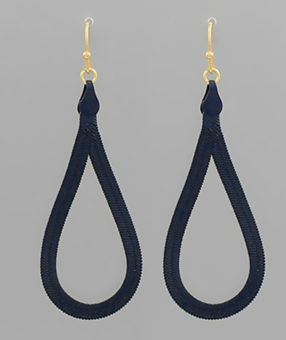 Make a vibrant statement with these Navy Teardrop Earrings featuring a color-coated herringbone chain design. Crafted from metal, their 2 3/4-inch length and elegant teardrop shape beautifully complement any outfit. The comfortable fish hook closure ensures easy wear while adding a pop of bold, eye-catching color to your look.