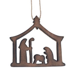 Celebrate the true meaning of Christmas with this beautifully carved Holy Family ornament. Crafted from dark brown wood, it features a detailed Nativity scene beneath the creche and hangs from rustic twine for a classic, natural look. Perfect for traditional Christmas décor or as a thoughtful gift.