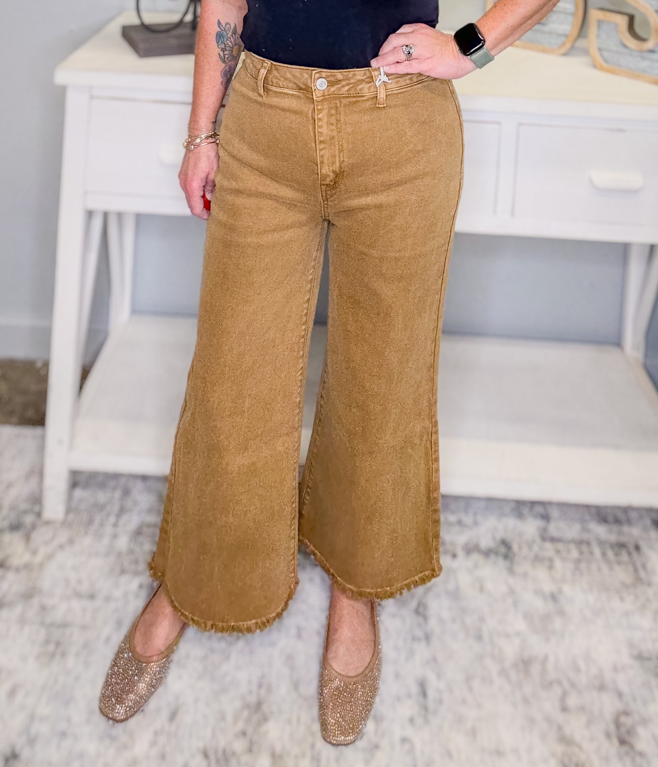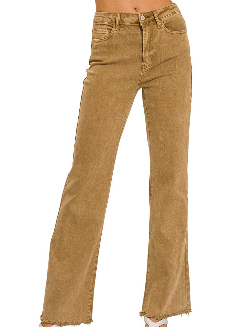 Acid Washed Frayed Cutoff Hem Wide Leg Pants – Deep Camel