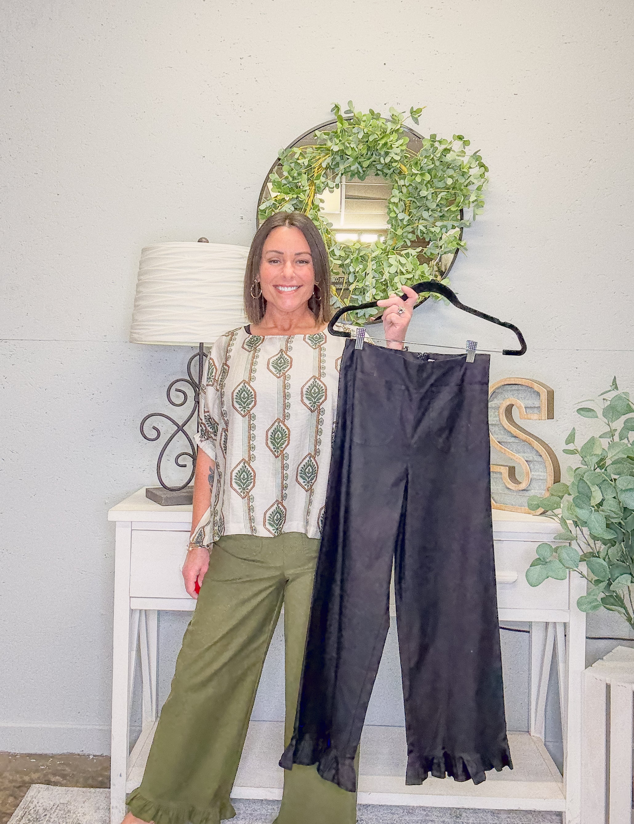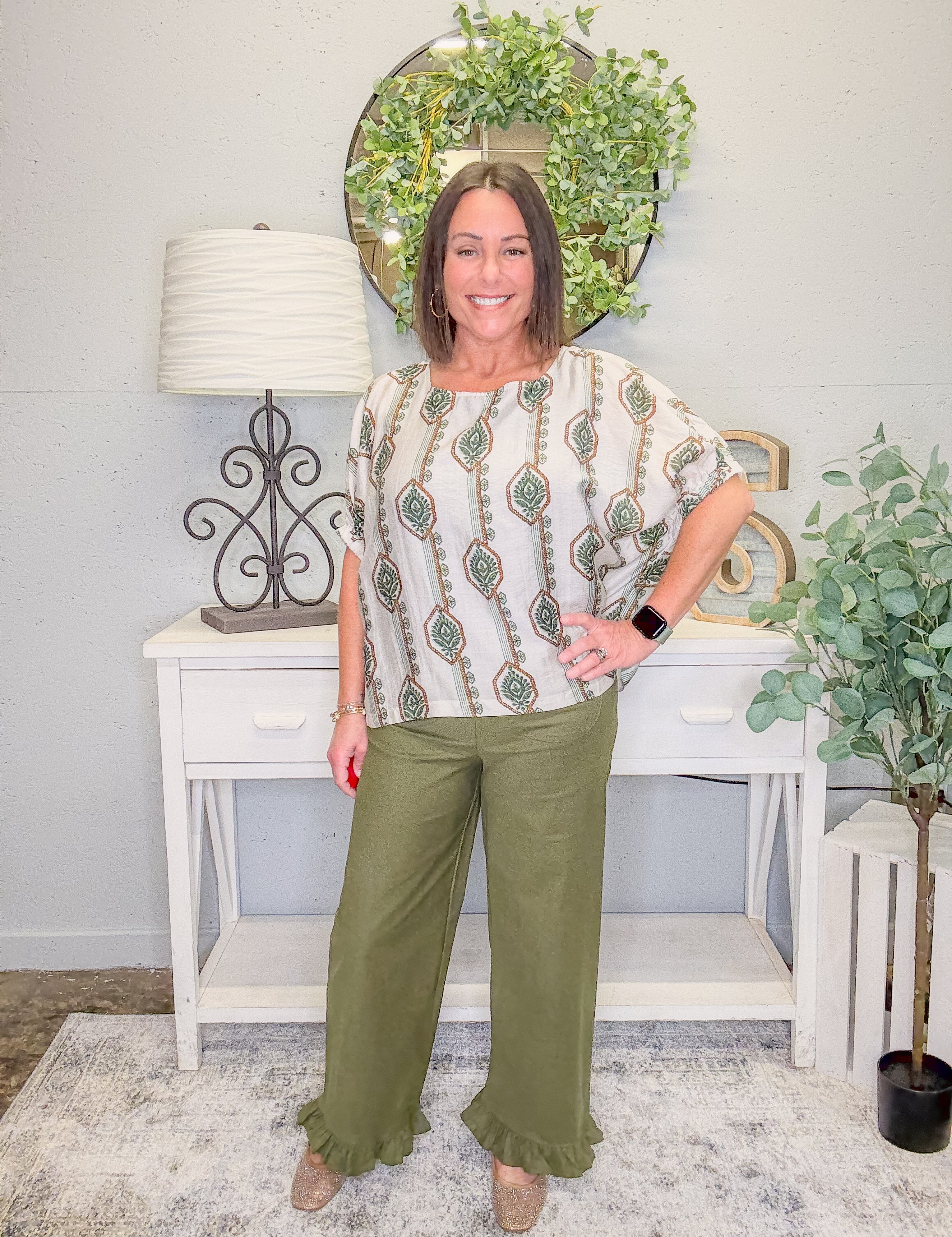 Straight Leg Ruffle Hem Pants – Olive
