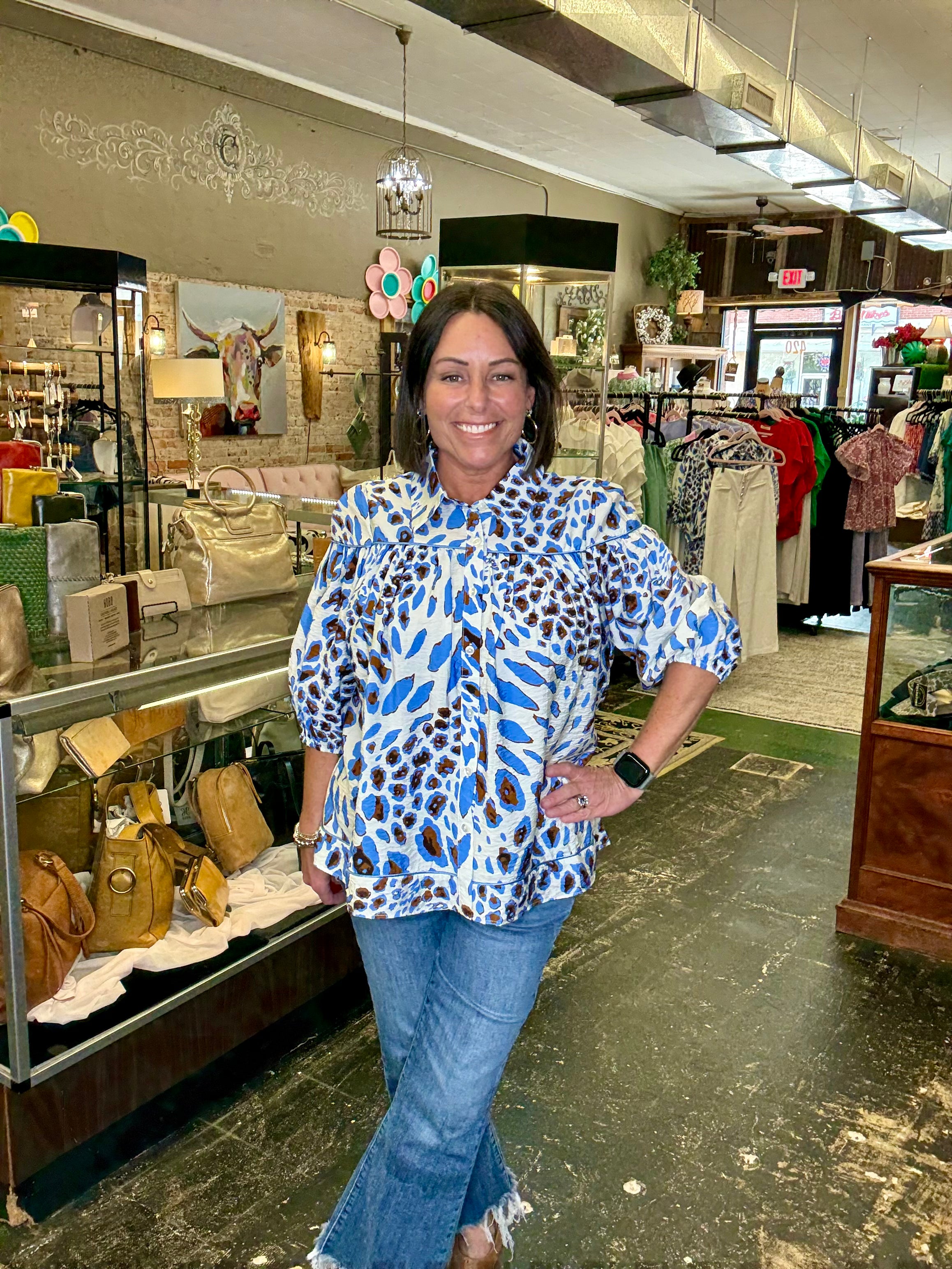 Add a little wild to your wardrobe with our Blue Leopard Puff Sleeve. This fresh twist on animal print features bold splashes of lime green and violet on a lightweight white base, giving it just the right amount of pop. The button-down front, gathered yoke, and voluminous puff sleeves bring in all the playful, feminine vibes — perfect for work or weekend wear.