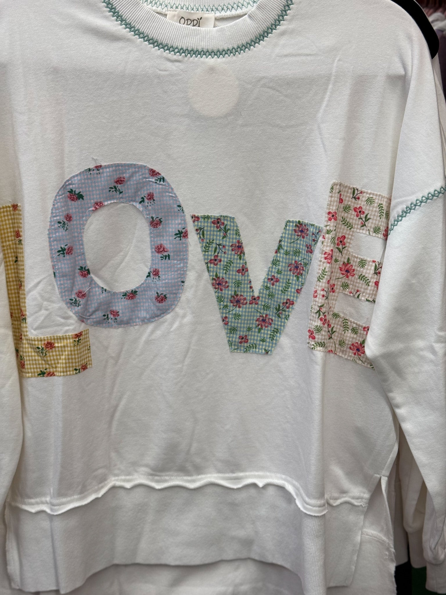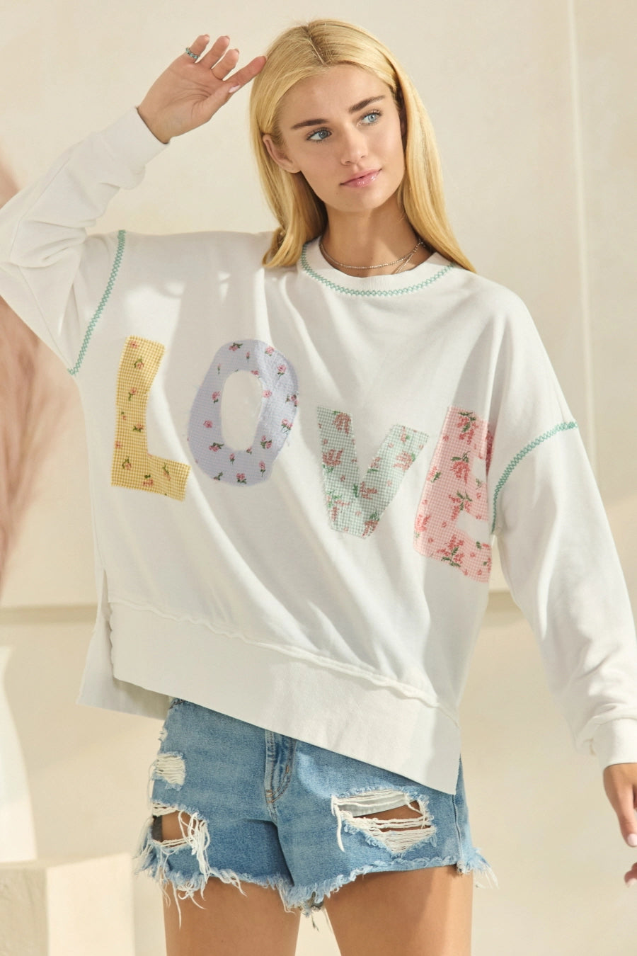 Indulge in an effortlessly stylish and romantic look with our LOVE contrast patch french terry sweatshirt. The intricate embroidery detail adds a touch of elegance to this cozy top, making it the perfect addition to your wardrobe. Show your love with every wear!