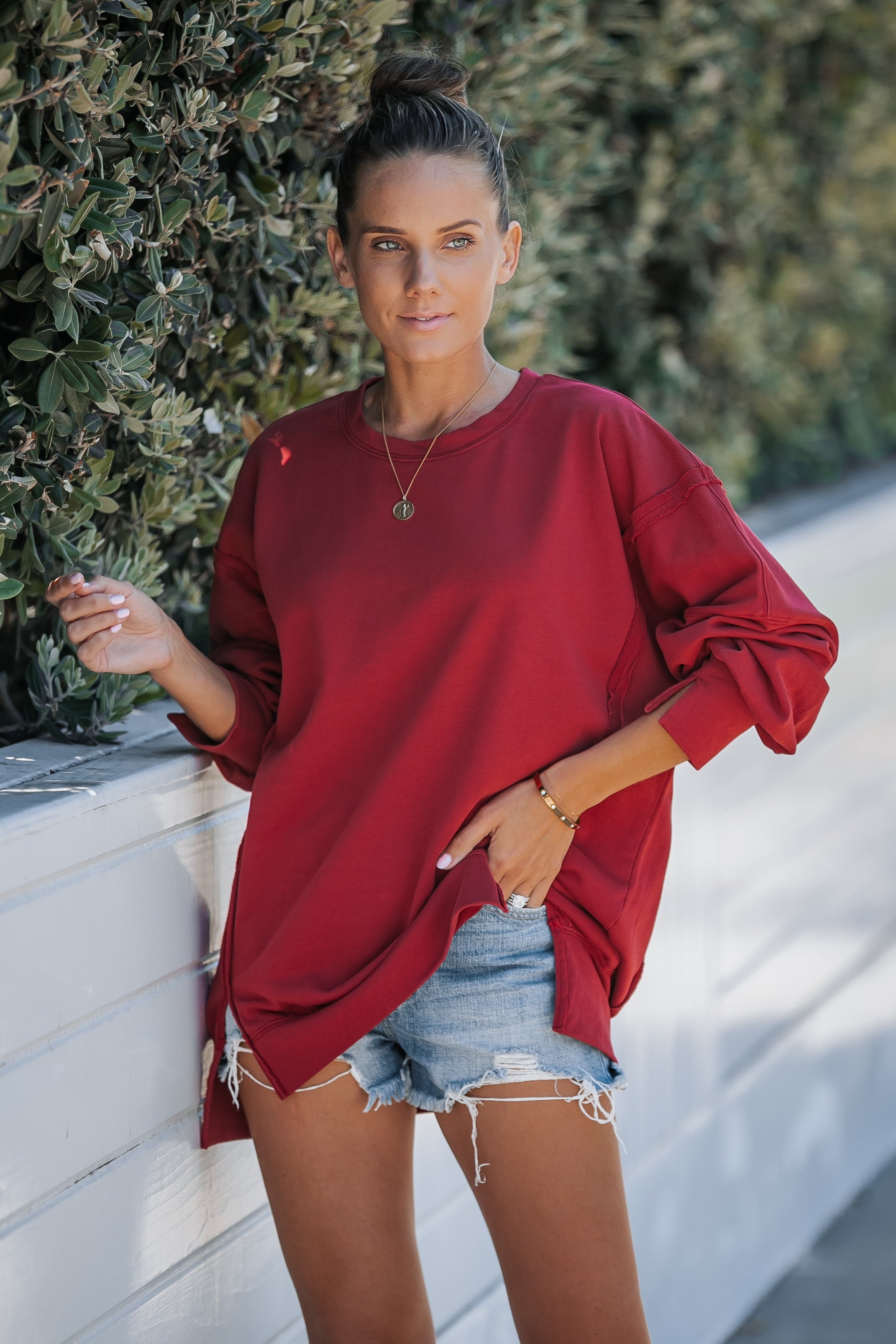 Our Oversized Burgundy Sweatshirt is perfect for those who crave comfort and style! The slouchy fit and raw, exposed seams give a relaxed yet trendy look, while the scoop neck and high-low hem add a touch of femininity. Don't forget the side-slit detail for an extra pop of flair. Stay cozy and chic in our oversized sweatshirt!