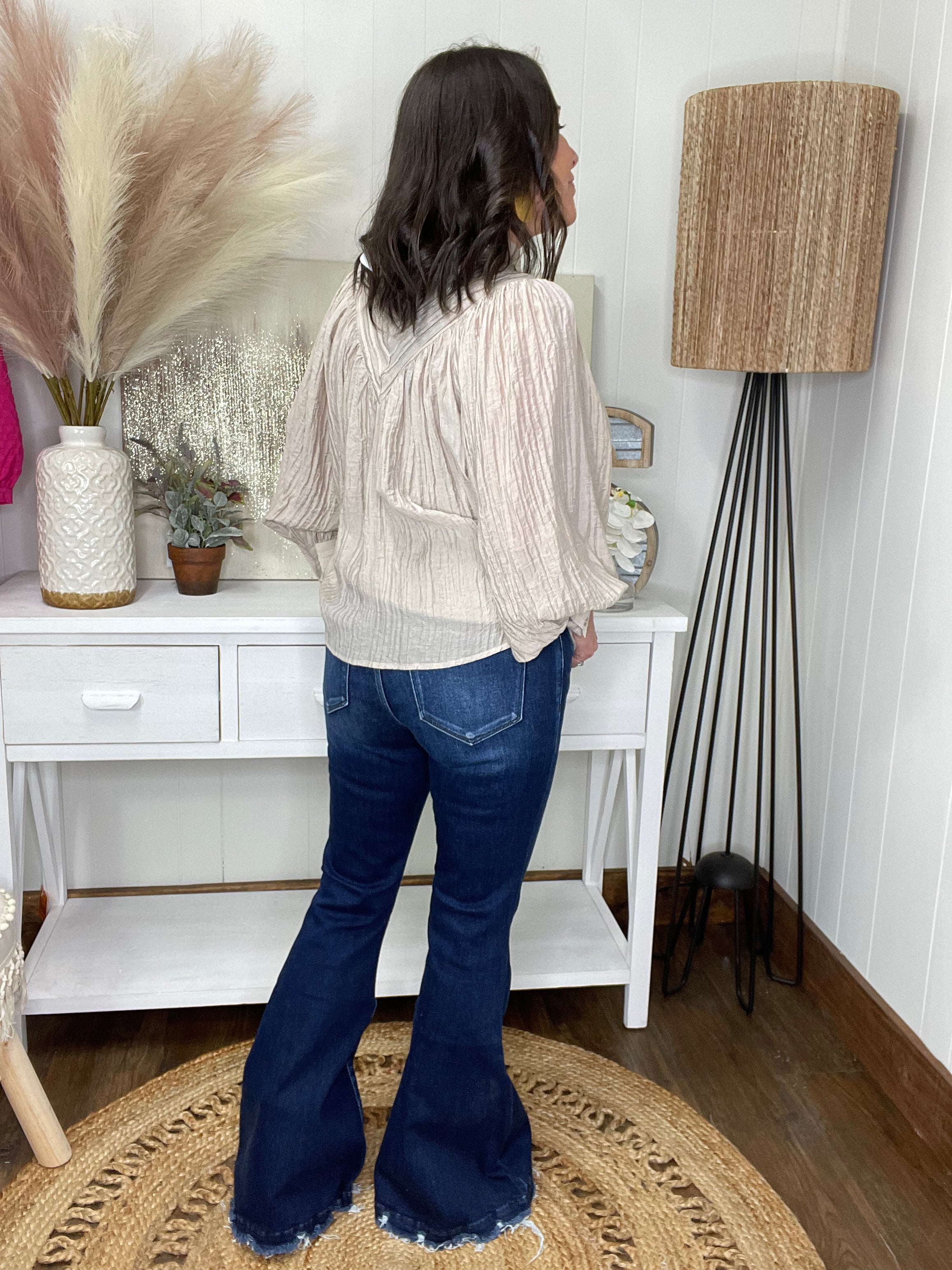 This Pleat Perfect Blouse is the perfect addition to your wardrobe. Crafted from a lightweight and dressy fabric, its solid sand color and buttoned pleat detail gives it a distinctive look. It's perfect for day and night, making it an ideal choice for any occasion.