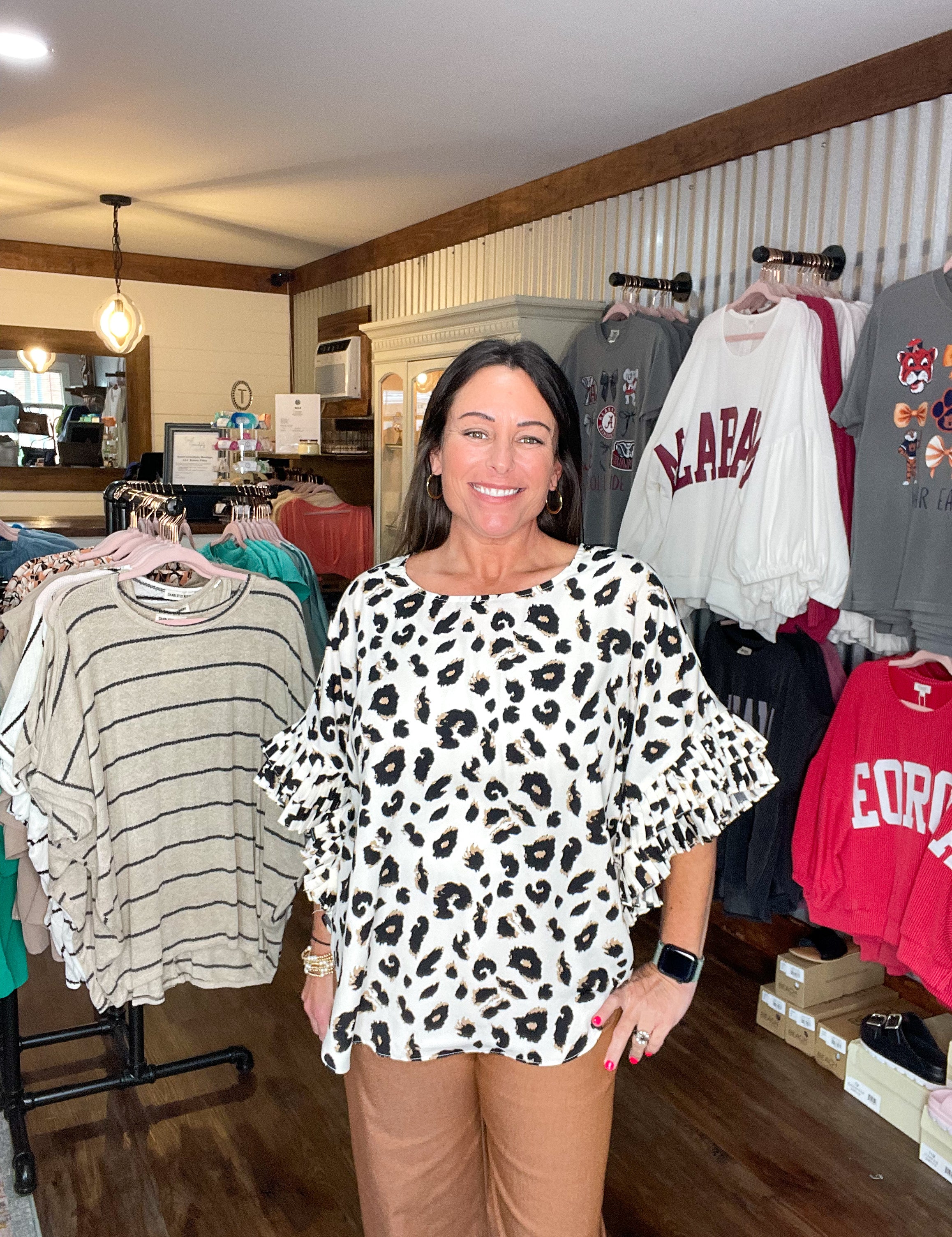 Leopard Print Pleated Ruffle Sleeve Top