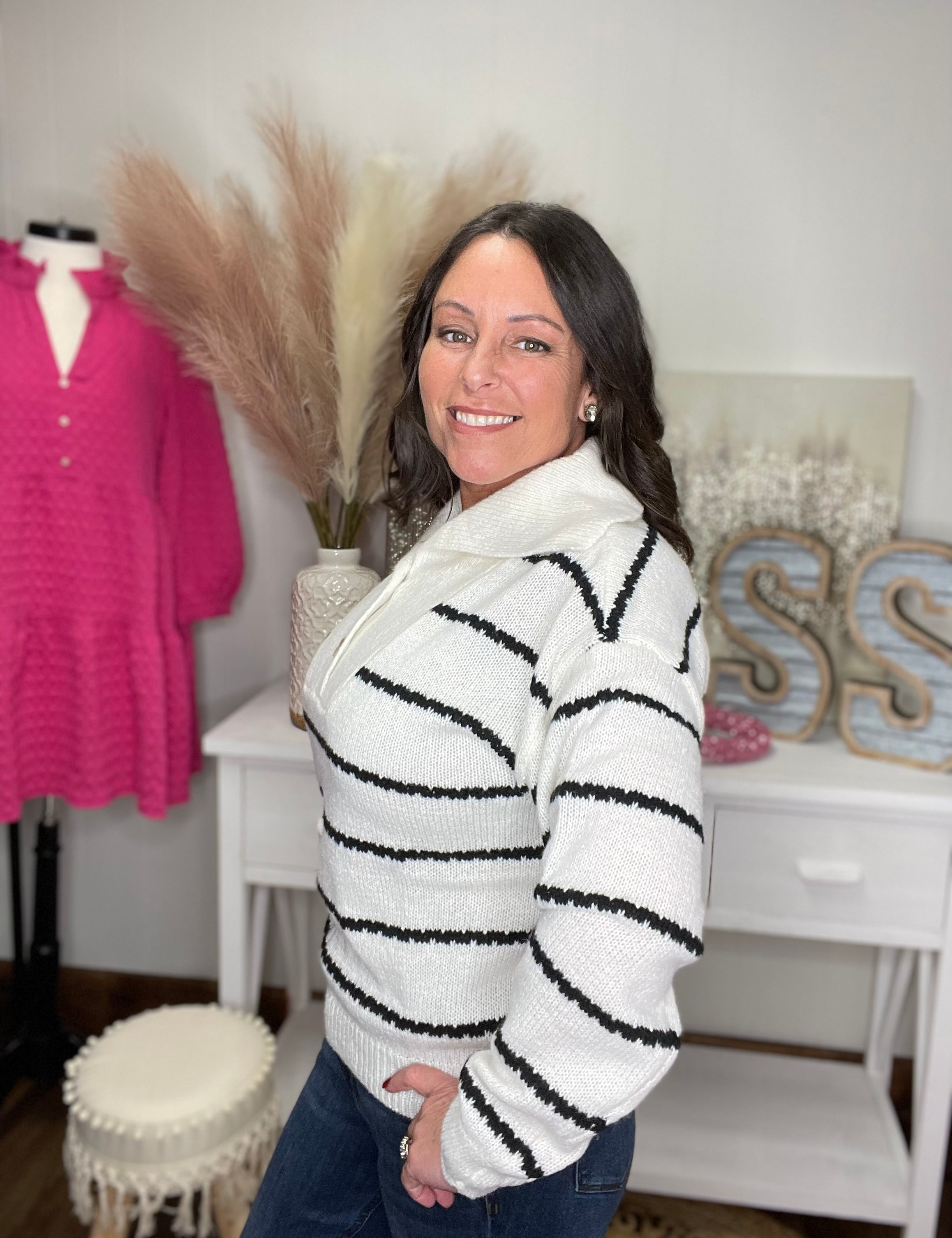 Long sleeve white sweater black striped collared neck