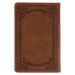 The handsome faux leather cover features an ornate heat-debossed frame with elegant corner scroll designs and a gold-foiled title and verse, giving it a refined, masculine look.