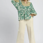 A fun mix of patterns and color makes this top an easy go-to! Featuring a soft abstract green print with a pop of gold in the collar and cuffs, this flattering blouse pairs perfectly with denim or your favorite cream bottoms.