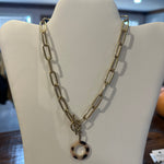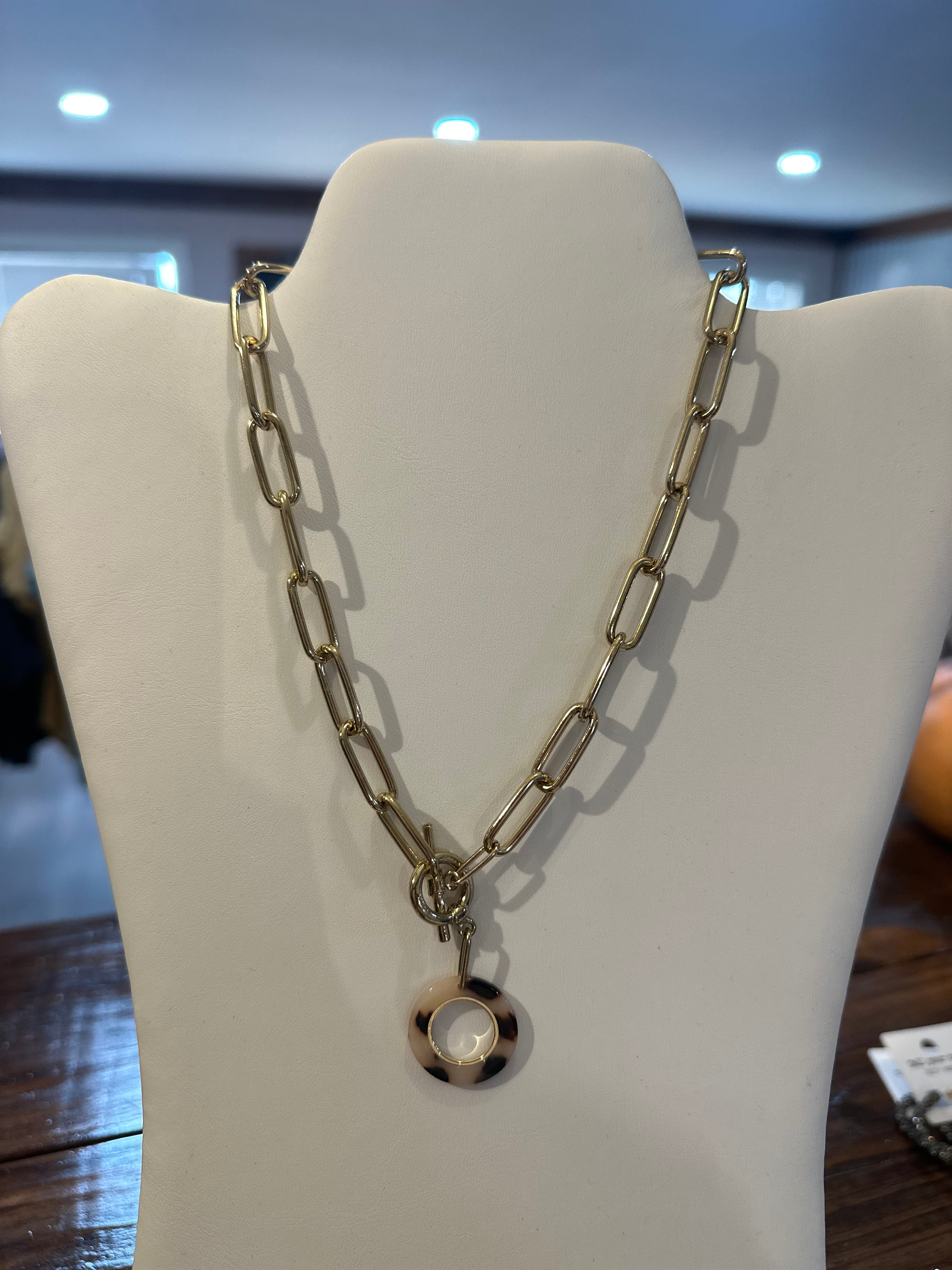 Introducing the Acrylic Circle + Chain, an elegant accessory that combines a light tortoise shell acrylic pendant with an alluring gold chain. The perfect piece for formal events, it is sure to make a statement with any look.