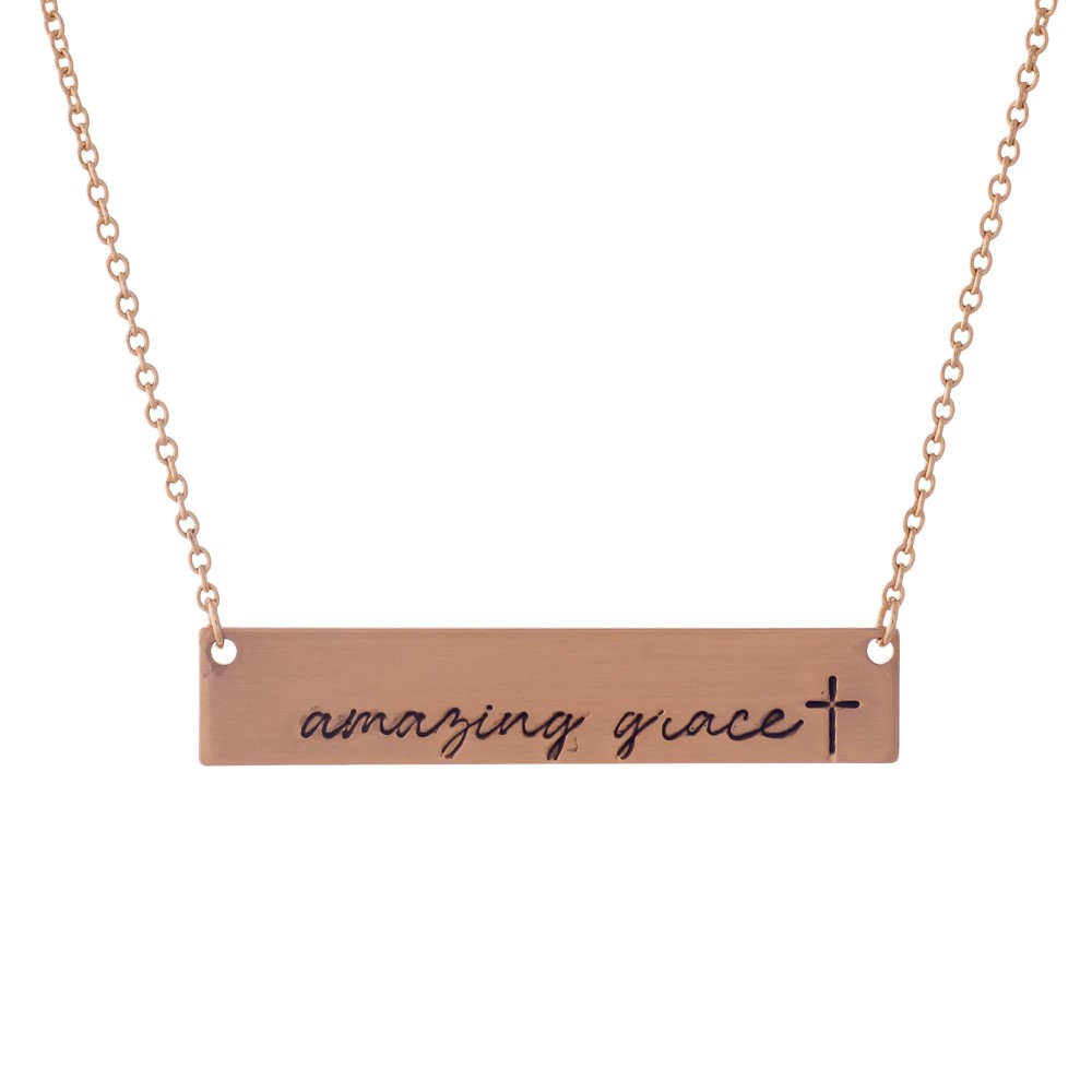 Dainty rose gold tone necklace with a bar pendant, stamped with "Amazing Grace." Approximately 16" in length.