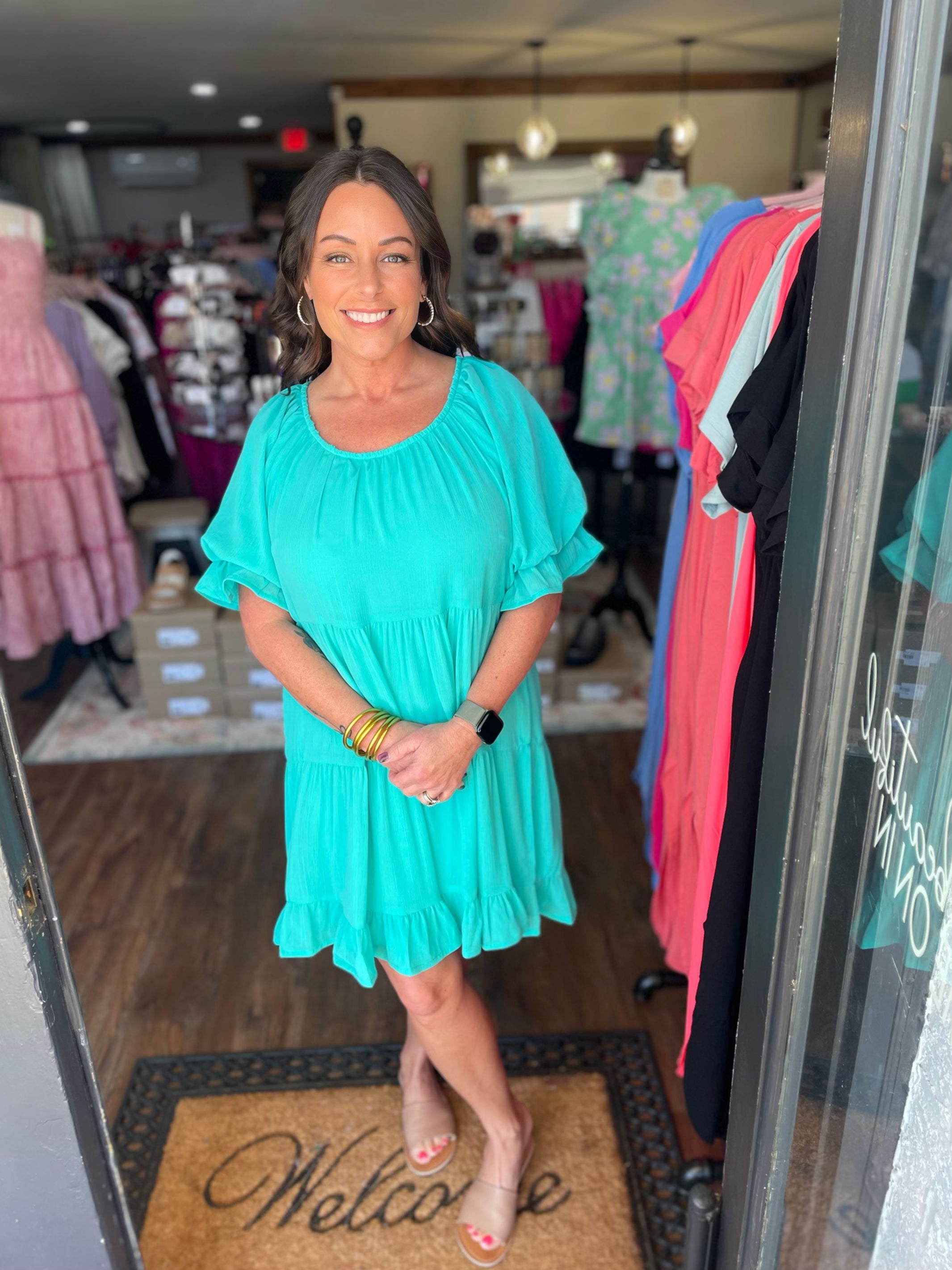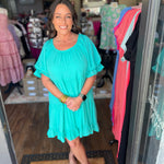 Introducing the "Aqua Elegance" Dress from Umgee, a masterpiece of design that combines playful charm with sophisticated style. This round neck, ruffled tiered A-line dress is a celebration of femininity, featuring delicately puffed ruffle sleeves that add a touch of whimsy and elegance to your silhouette. Crafted in a vibrant turquoise hue, this dress is a nod to the serene beauty of the ocean, making it a perfect choice for any occasion that calls for a splash of color and a dash of elegance.