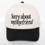 Spread love and apologies everywhere you go with our 'Sorry about my Boyfriend' Two Tone Baseball Cap. Made with 100% cotton and a snap back closure, it's designed to fit most sizes comfortably. Show your sincere remorse and make a fashion statement with this embroidered cap.