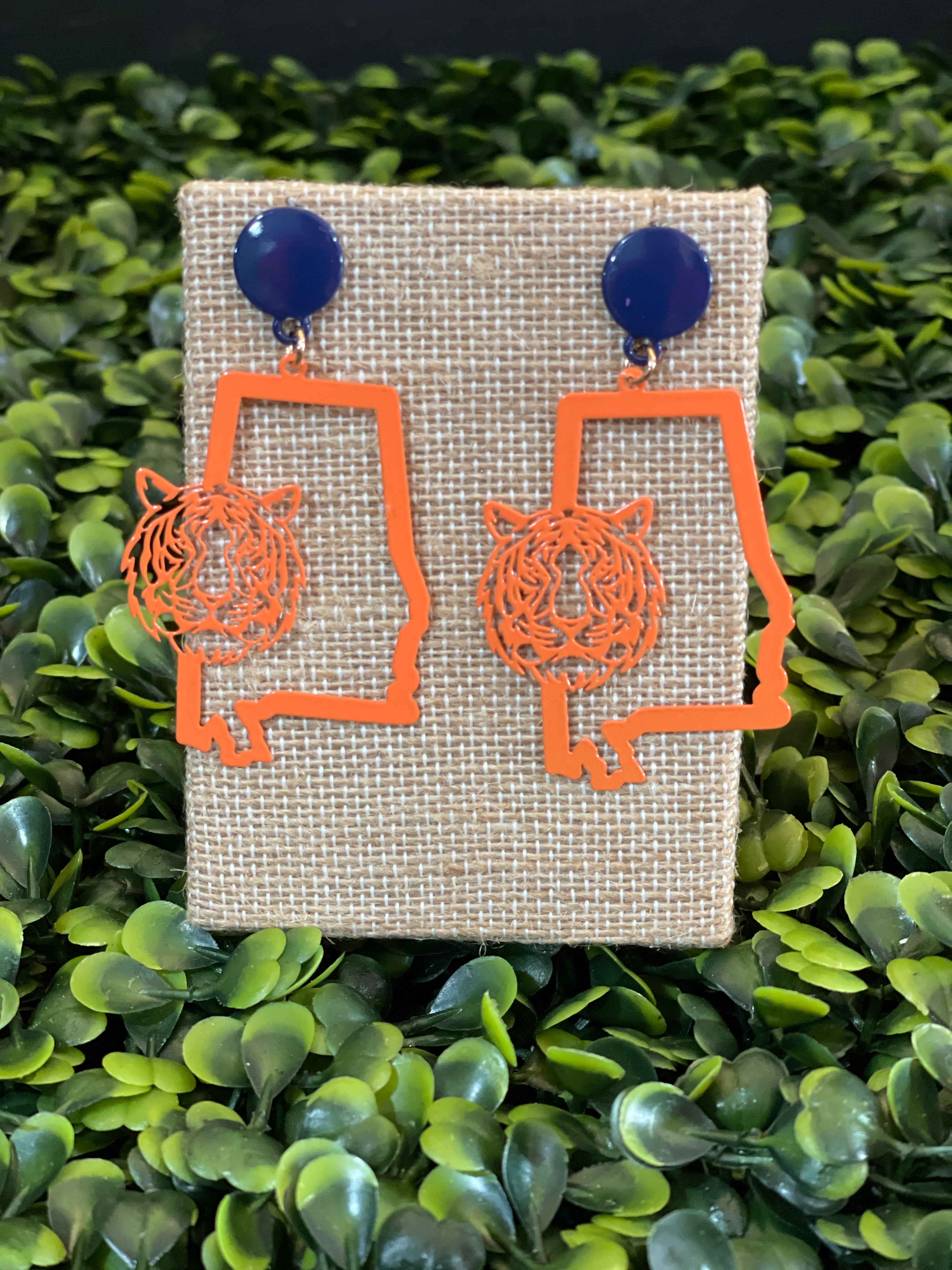 Show off your love for Alabama with our State Tiger Filigree Earrings! Featuring a fierce tiger design in orange with a navy accent on a post, these earrings add a unique and stylish touch to any outfit. Show your state pride and make a statement with these earrings.