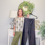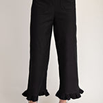 Classic black meets playful charm in these straight-leg pants with a ruffled hem. Featuring a high-waisted fit, functional front patch pockets, and a back zipper closure. Ideal for work, dinner, or weekend style.
