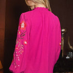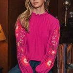 Textured airflow long-sleeve blouse featuring embroidery sleeve with smocked neck.