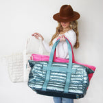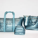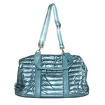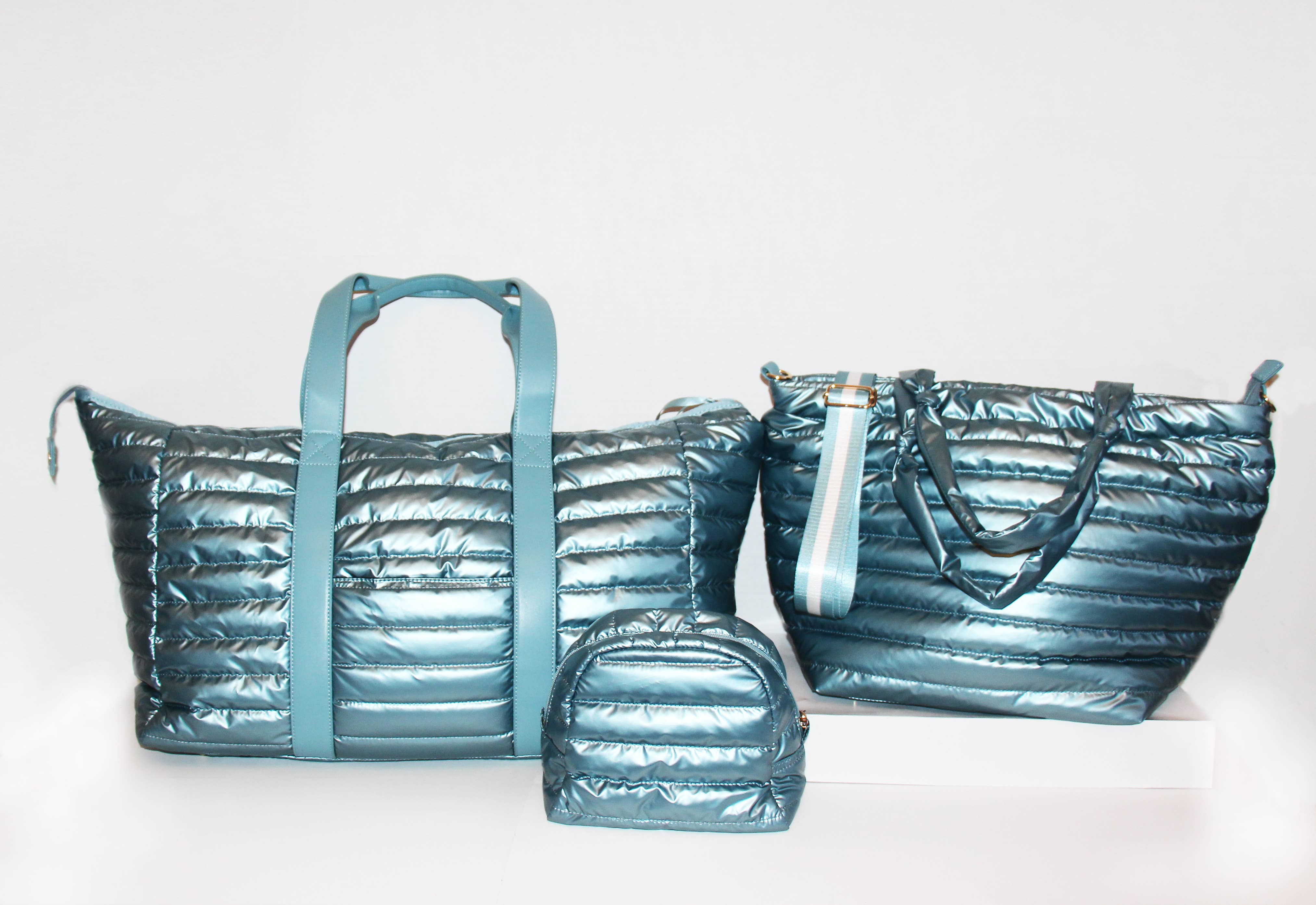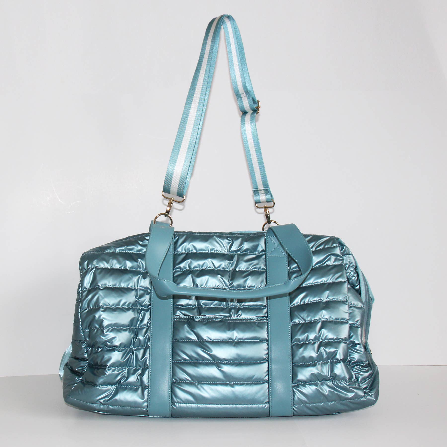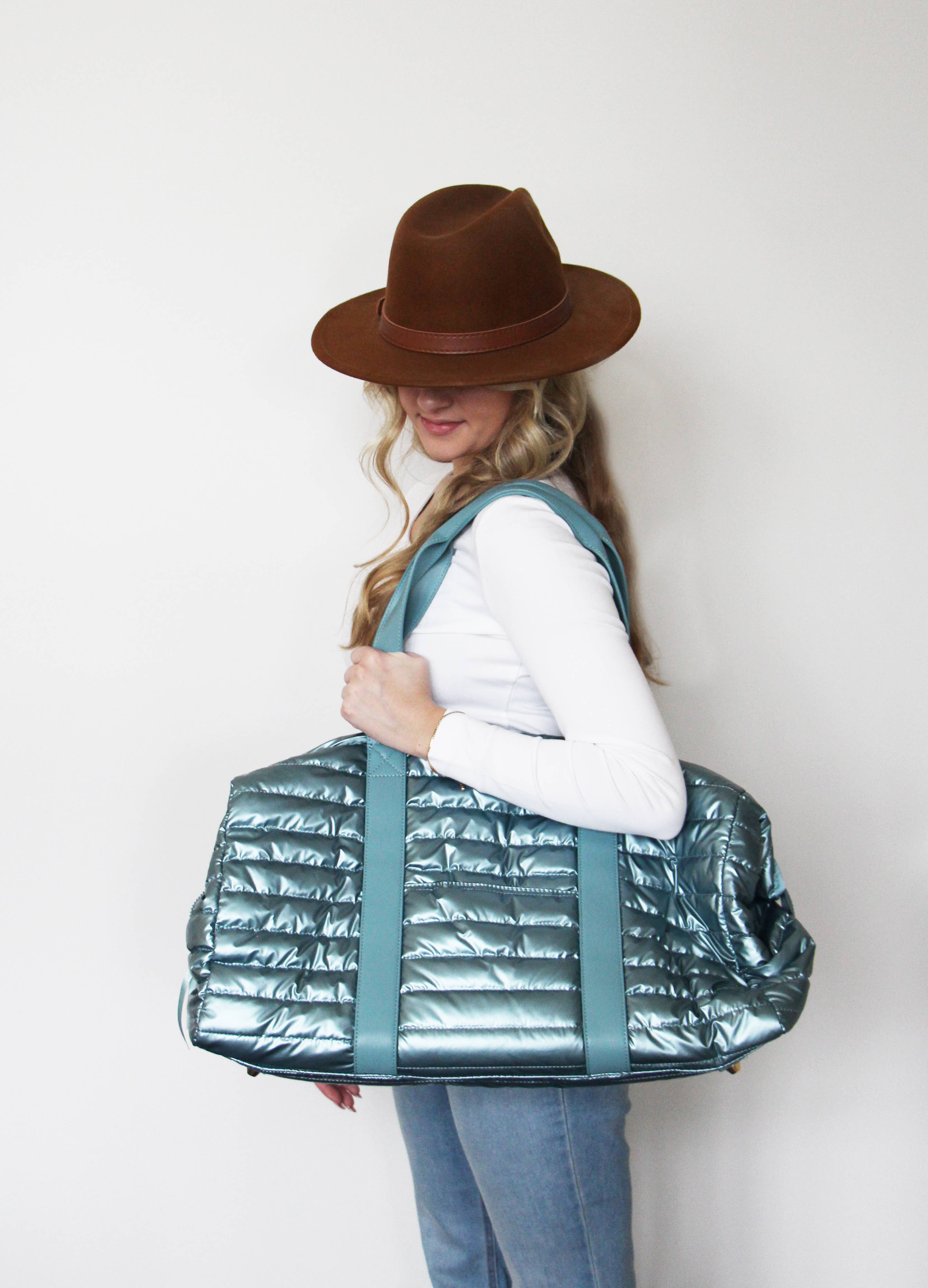 The Cassie Weekender features an exterior made of puffer nylon in a variety of hues. Several interior zippered and velcro pockets, luggage strap, and a removable hard base for extra stability Care: Hand wash or delicate cycle in cold water with gentle soap.Do not bleach. Hang to dry.Dimensions: 26in L x 10in W x 15.5in H