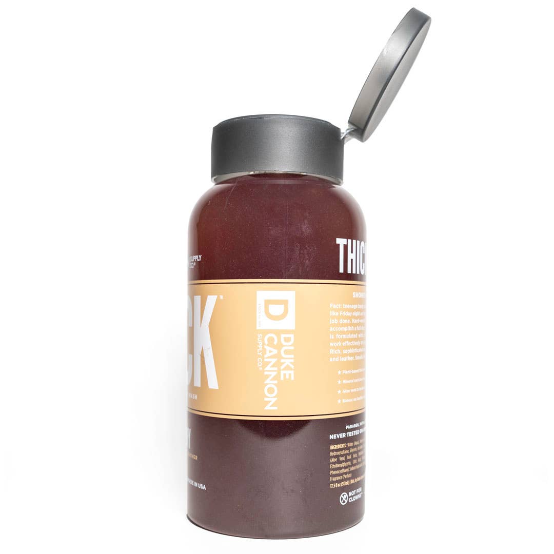That's why Duke Cannon's THICK is formulated with a noticeably higher viscosity and built to work effectively on your body, not spew down the shower drain.