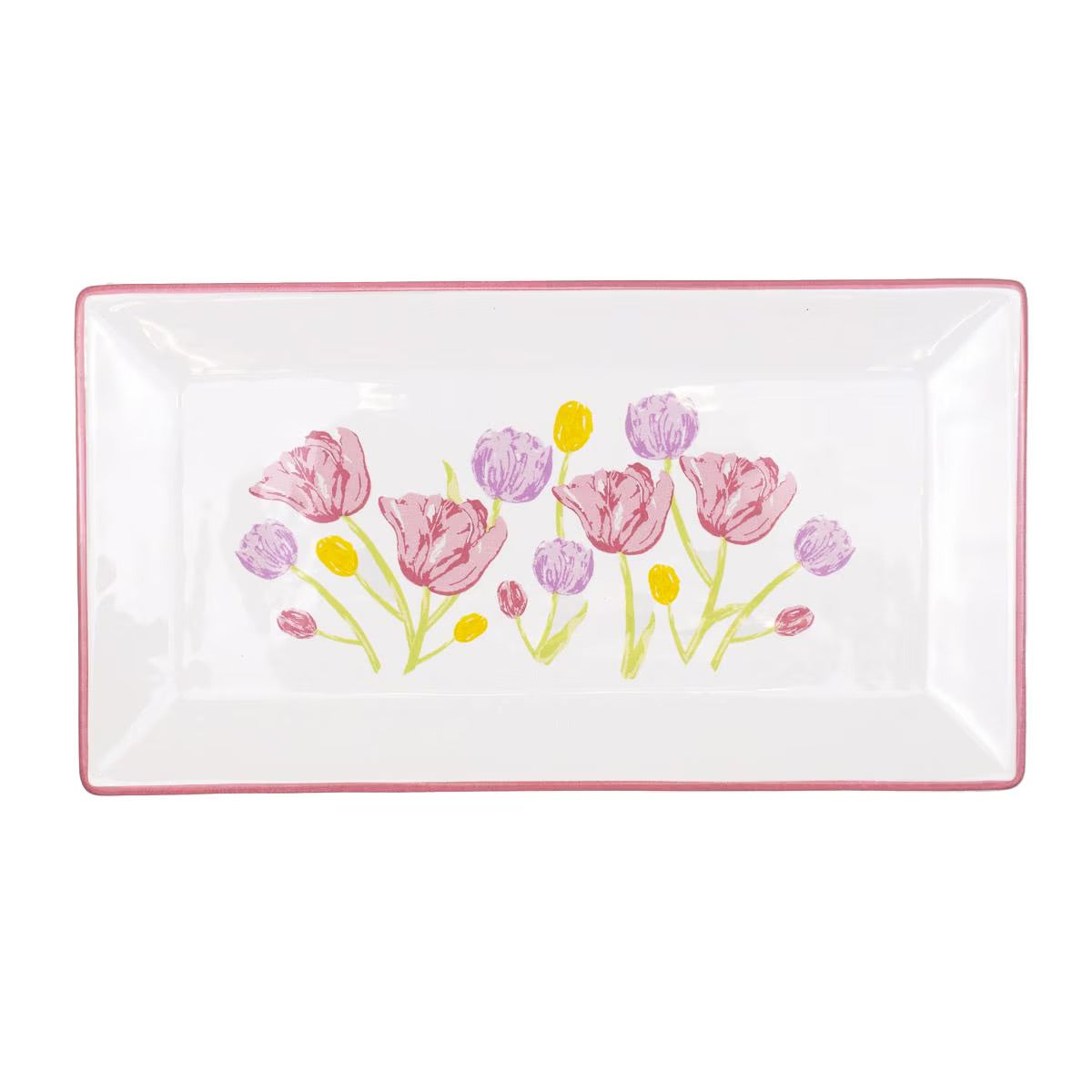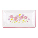 Infuse your serving collection with a touch of nature with our Tulip Fields Rectangle Platter. Measuring 12x6.5 inches, this crisp white platter boasts a stunning tulip field design in vibrant multi-tones. Perfect for bringing a fresh and colorful touch to any gathering
