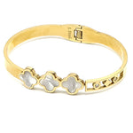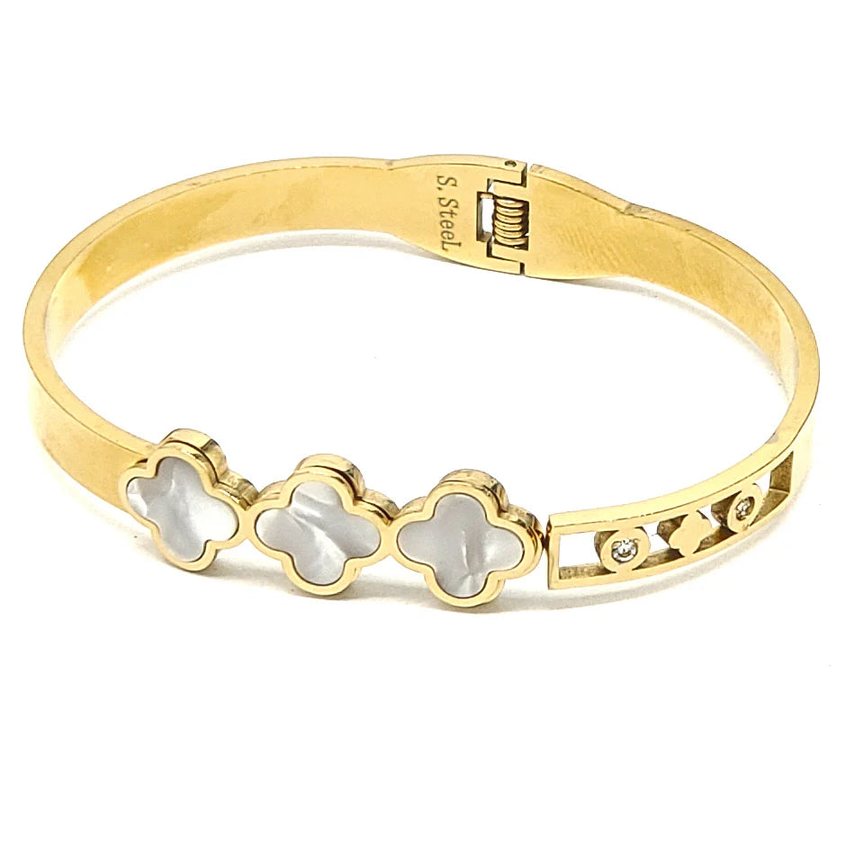 Experience luxurious elegance with our White Mother Of Pearl Bracelet. The exquisite clover design, made with stainless steel, is hinged for easy wear and features the shimmering beauty of white mother of pearl. Elevate any outfit and make a statement with this stunning piece of jewelry.