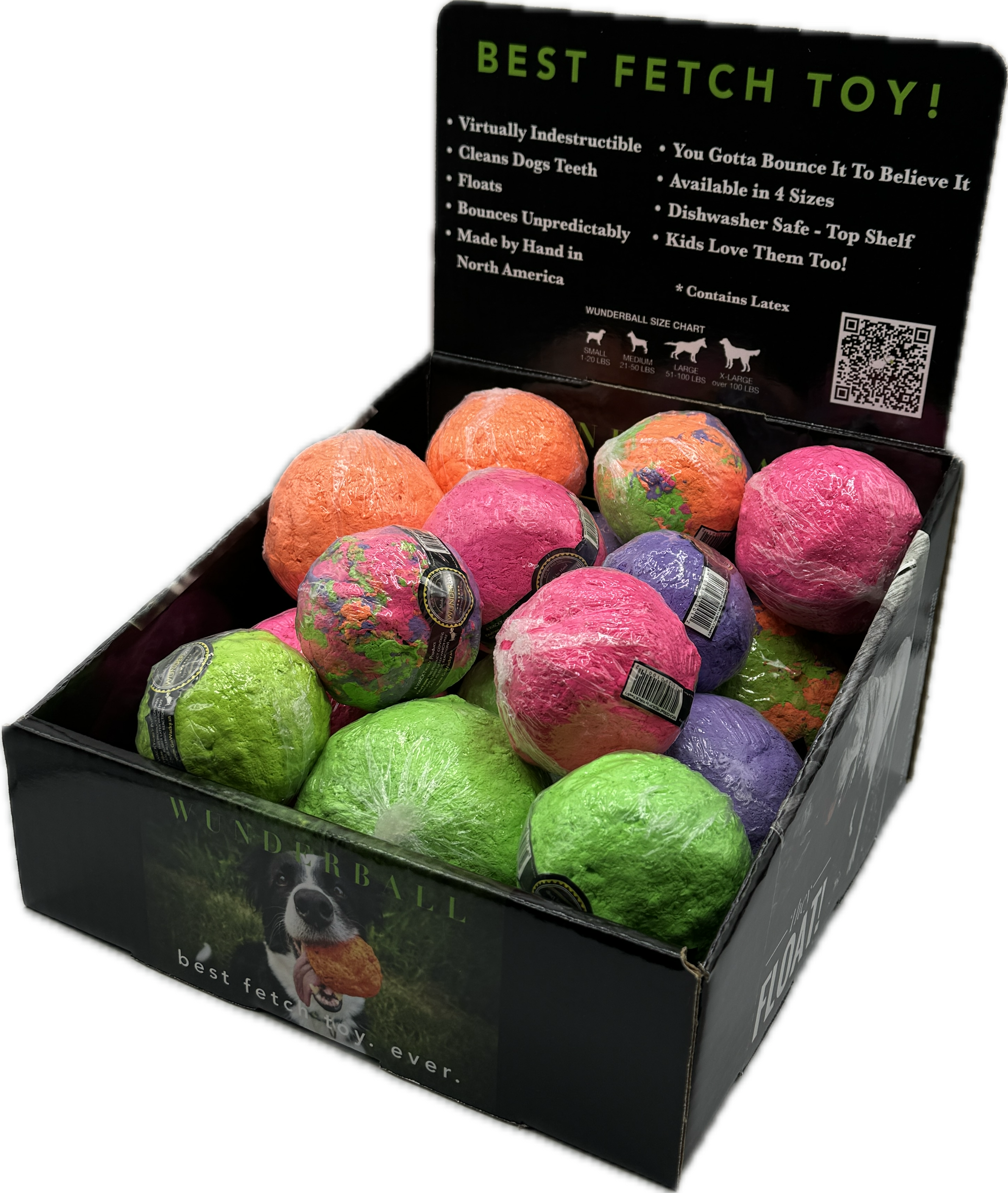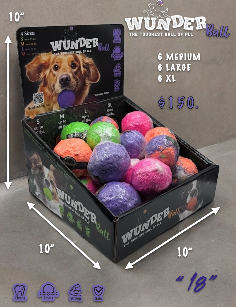 OUR NEWEST AND SMALLEST DISPAY. WUNDERBALL is so much more than just a "ball" The WUNDERballs are safe for your pup and the planet! They are 100% made by hand from natural rubber right here in North America. They clean teeth, bounce unpredictably, float, and are indestructible! Available in 4 sizes for dogs from 5 to 200 pounds.
