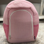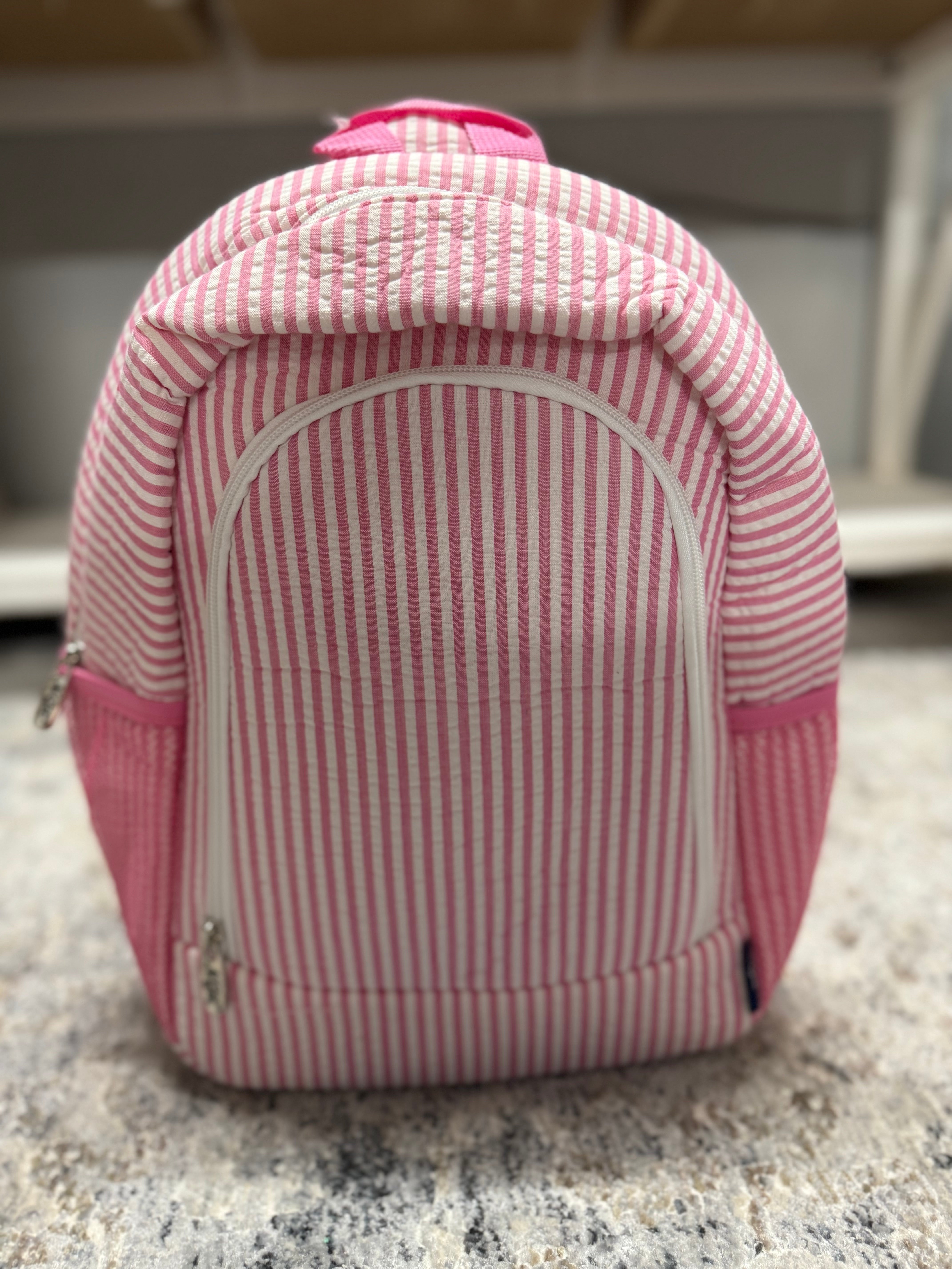 A timeless take on a functional favorite! Our Classic Seersucker Backpack is the perfect size for school, travel, or everyday use—available in both soft pink and navy blue.
