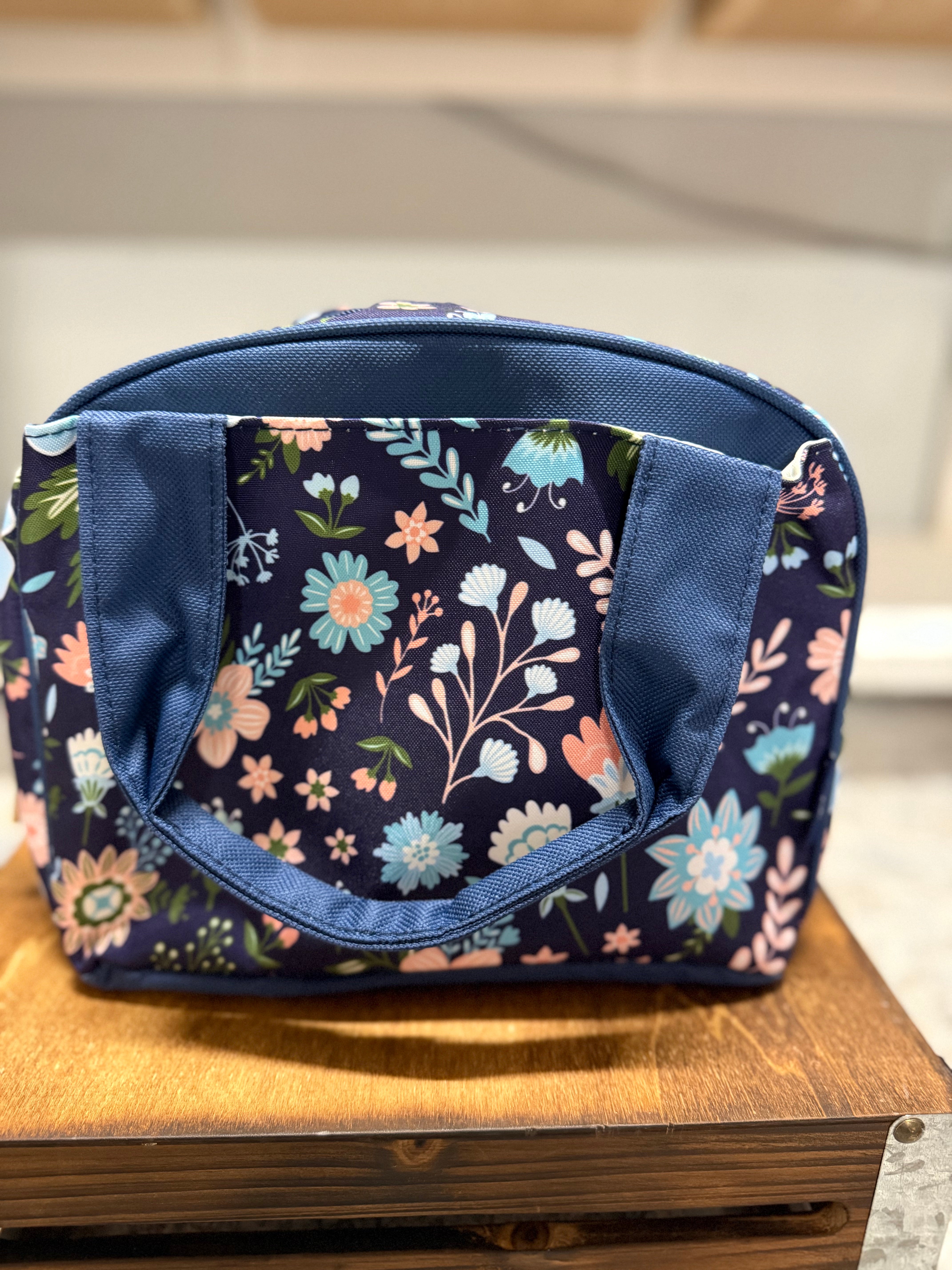 Add a pop of charm to your lunch break with this sweet bowler-style lunch tote! Featuring a whimsical floral print on a navy background, it’s the perfect mix of practical and pretty.