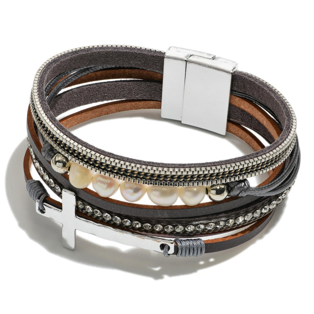 Multi-Strand Magnetic Bracelet with Cross & Freshwater Pearls – Gray