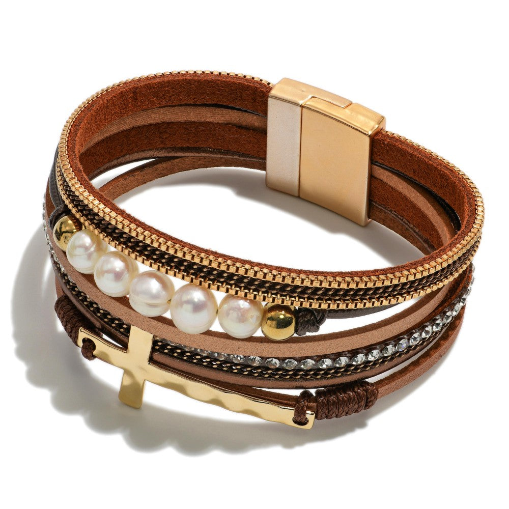 Multi-Strand Magnetic Bracelet with Cross & Freshwater Pearls – Brown