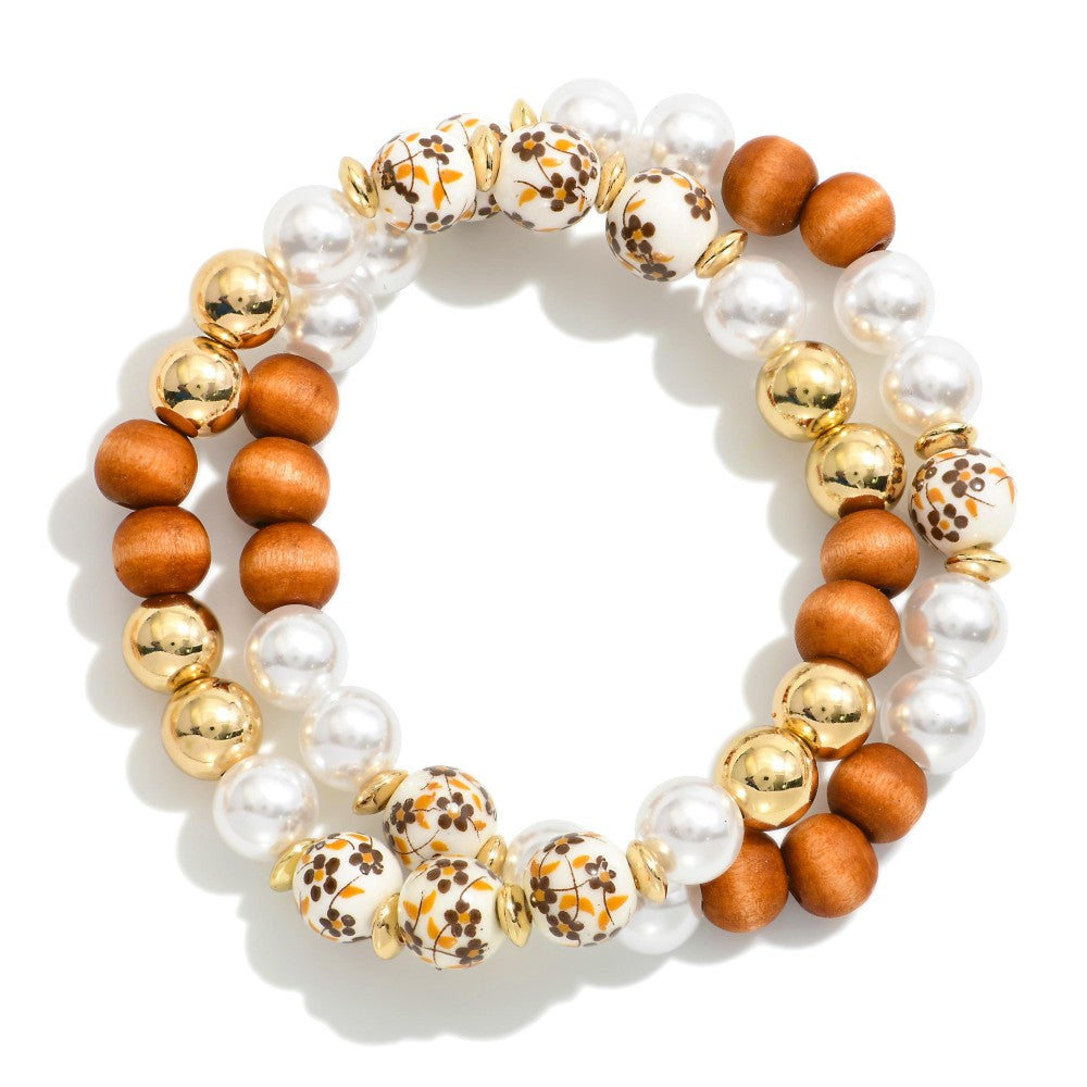 Wood, Pearl & Floral Porcelain Beaded Stretch Bracelet Set – 2 Pack