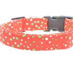 Classic and timeless, this red and green polka dot dog collar adds a touch of sophistication to your pup’s everyday style. Crafted from durable cotton fabric with an interior stabilizer, it’s folded and sewn to create eight layers of strength. The curved side-release buckle ensures comfort, while the nickel-plated D-ring is perfect for attaching a leash or ID tags.