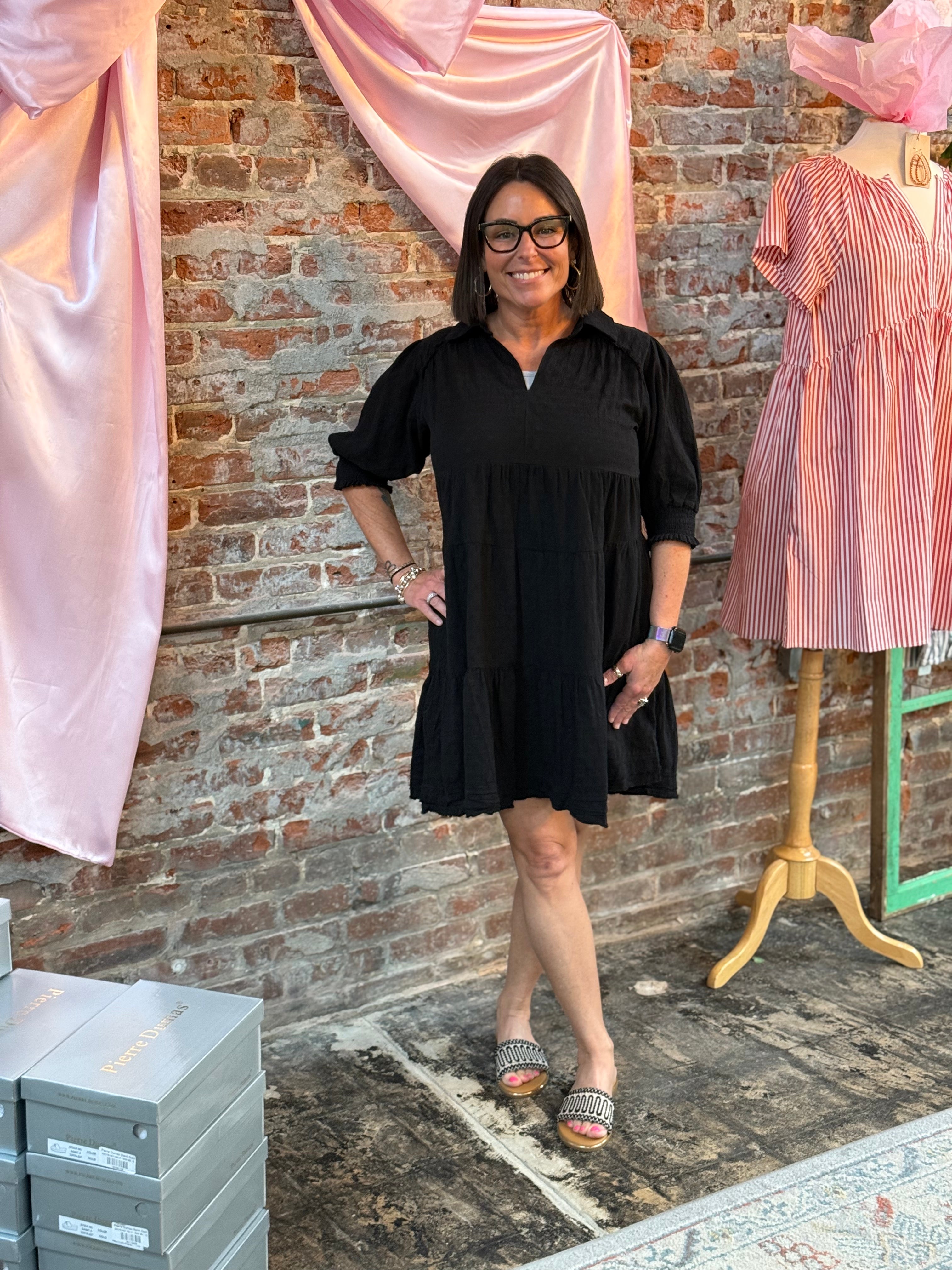 This black Umgee dress is the perfect blend of relaxed style and subtle edge. Designed with tiered layers and a raw hem finish, it creates a flowy, flattering silhouette that’s both comfortable and effortlessly cool. The folded short sleevesadd to its casual charm, making it an easy go-to for everyday wear.