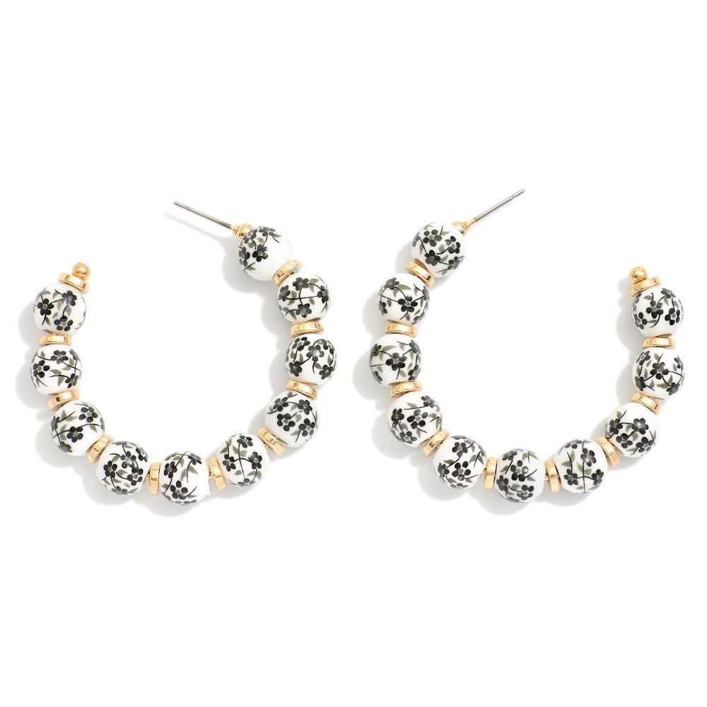 Timeless elegance to your look with these black floral chinoiserie-inspired hoop earrings. Featuring hand-painted black and white beads with gold disk spacers, these earrings bring a touch of sophistication to any outfit.