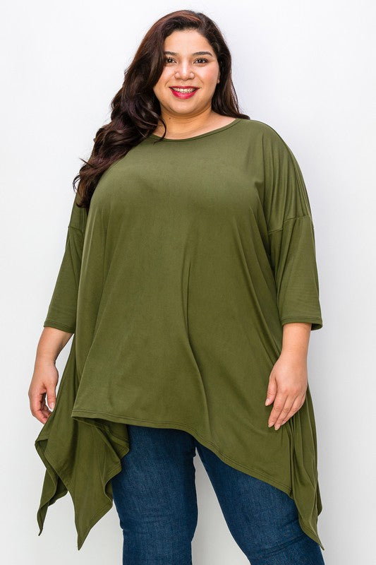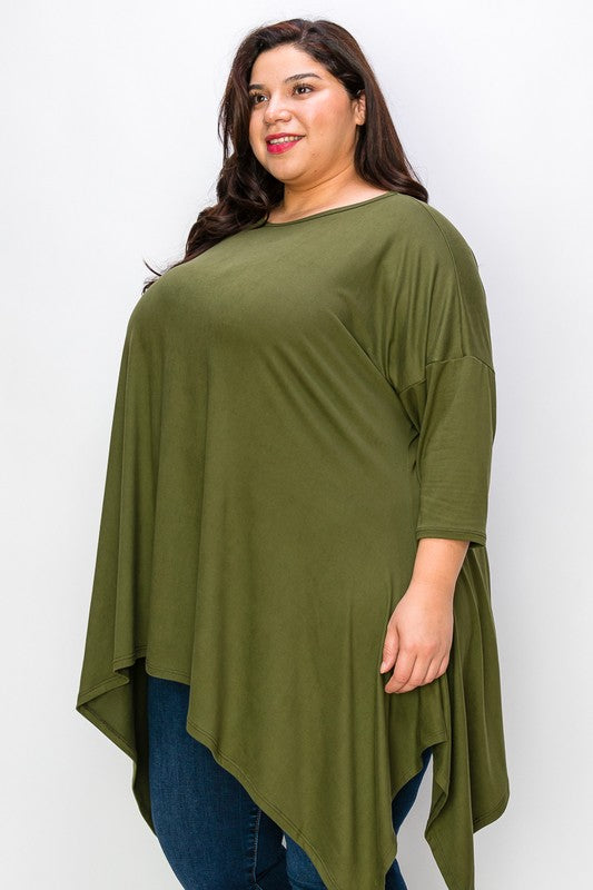 Elevate your look with the Effortless Elegance Side Drape Top in a rich olive hue! This extra plus-size top features a beautiful side drape detail, adding flow and sophistication to a timeless, solid-color design. Available in sizes 3XL-5XL, this piece is perfect for effortless styling with leggings or jeans. Its relaxed fit and soft fabric make it a go-to choice for both comfort and style – a wardrobe essential for any occasion.