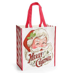 Bring holiday cheer everywhere you go with this festive Santa tote! Featuring a classic Santa face with holly on his hat and the cheerful message “Merry Christmas” across the bottom, this bag captures the spirit of the season. The red and white diagonal stripe gusset, red piping, and sturdy red handles add a fun, traditional touch. Perfect for gifting, shopping, or carrying holiday goodies!