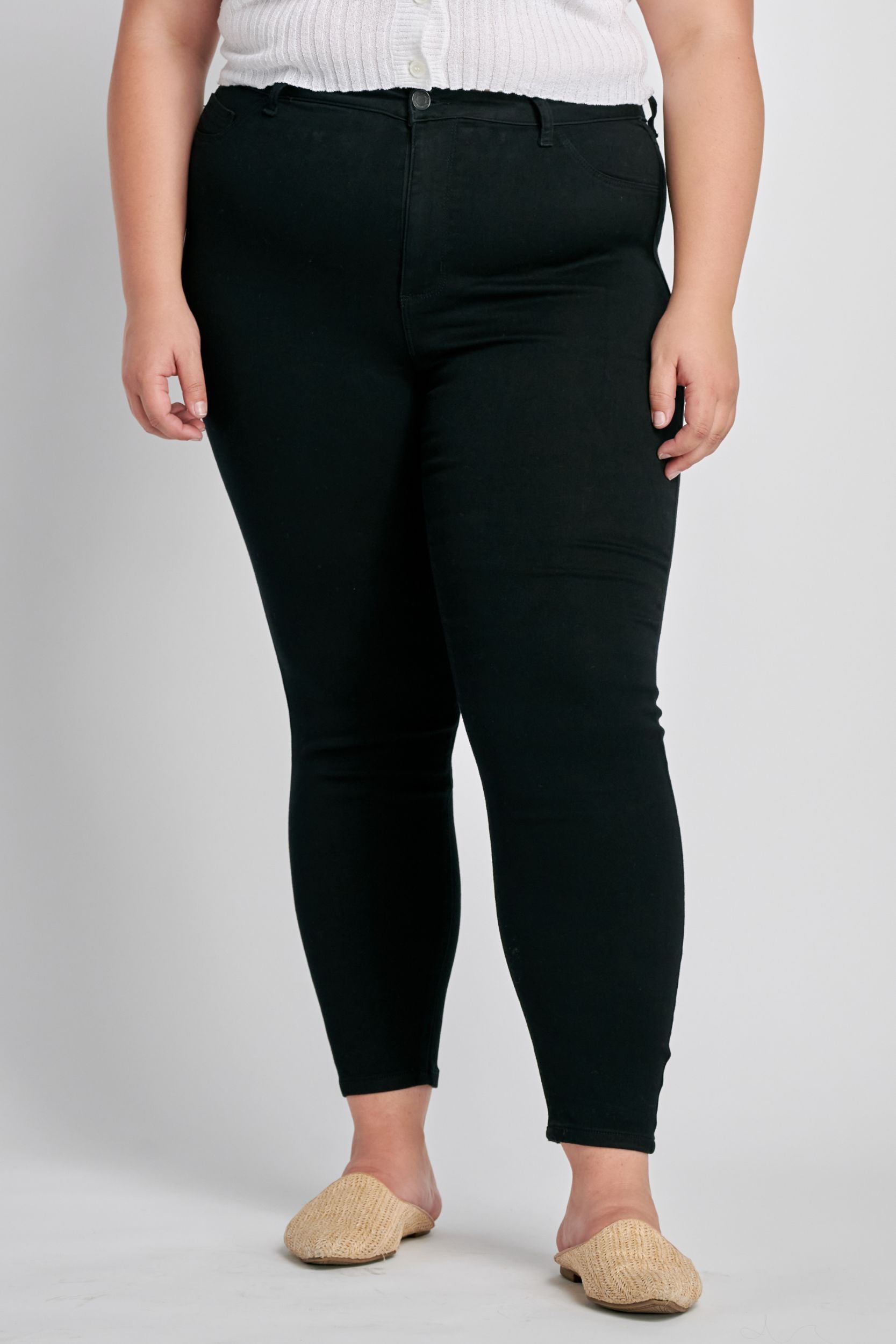 Experience the ultimate in comfort and style with our Curvy High-rise Black Jeans! Crafted from a blend of cotton, polyester, and spandex, these jeans provide a flattering high-rise and skinny fit. Featuring 5 pockets and a zip fly, these jeans are perfect for any occasion. Inseam measures 28 inches, with a front rise of 12 1/2 inches. Imported for quality and style.