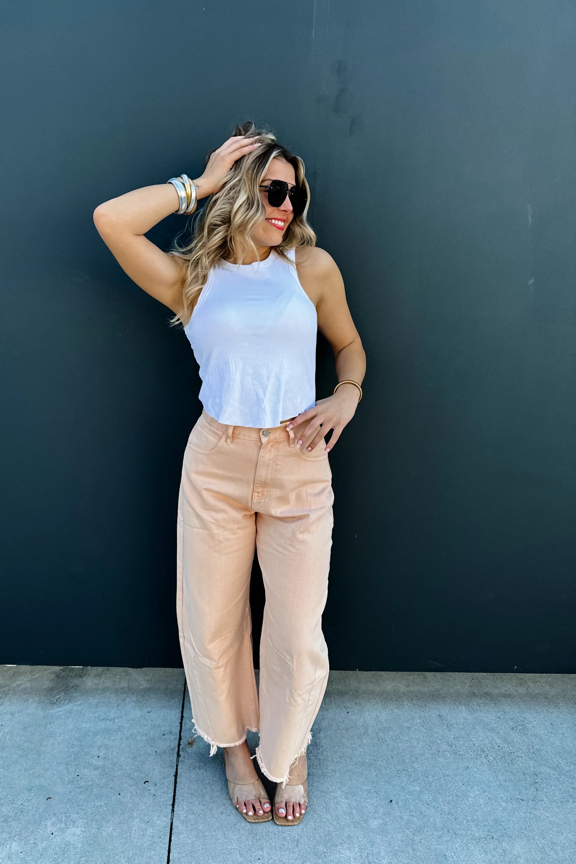 Experience the perfect fit with our Peach Barrel Jeans. The non-stretchy denim hugs your curves while the wide-legs add a touch of elegance. Darted knees and a raw hem create a flattering silhouette, perfect for spring. Complete the look with the detailed seams and belt loops. Elevate your denim game now!