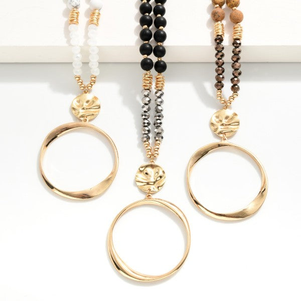 Long Beaded Chain Link Necklace Featuring Tapered Hoop Pendant