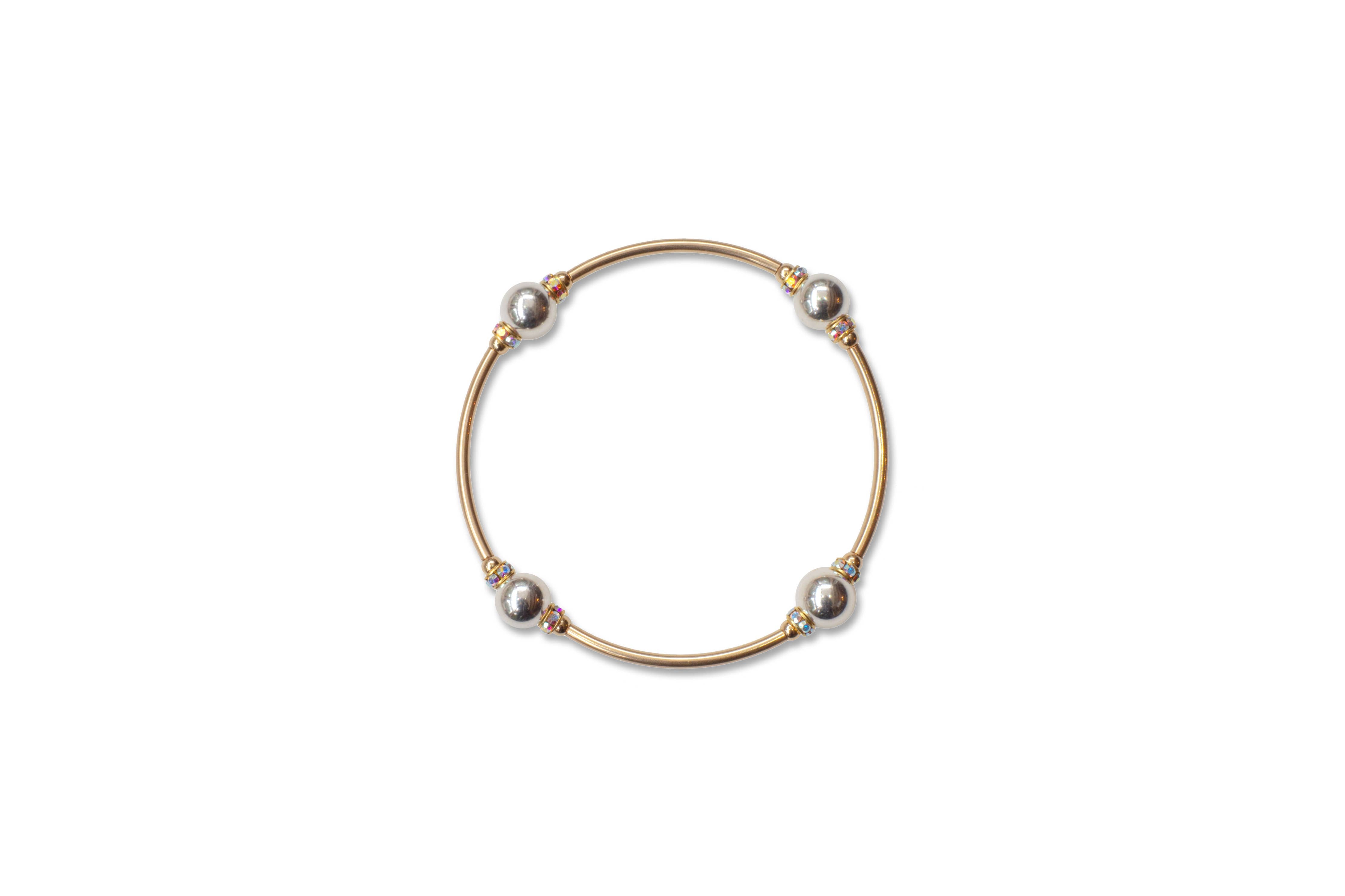 Elegant Gold-filled Gratitude Bracelet; 8 MM White Swarovski Crystal Pearls and gold Crystal Rondelles with Gold-Filled Link, Strung on Stretch Nylon; Standard Size fits most, up to 7" Wrist.
