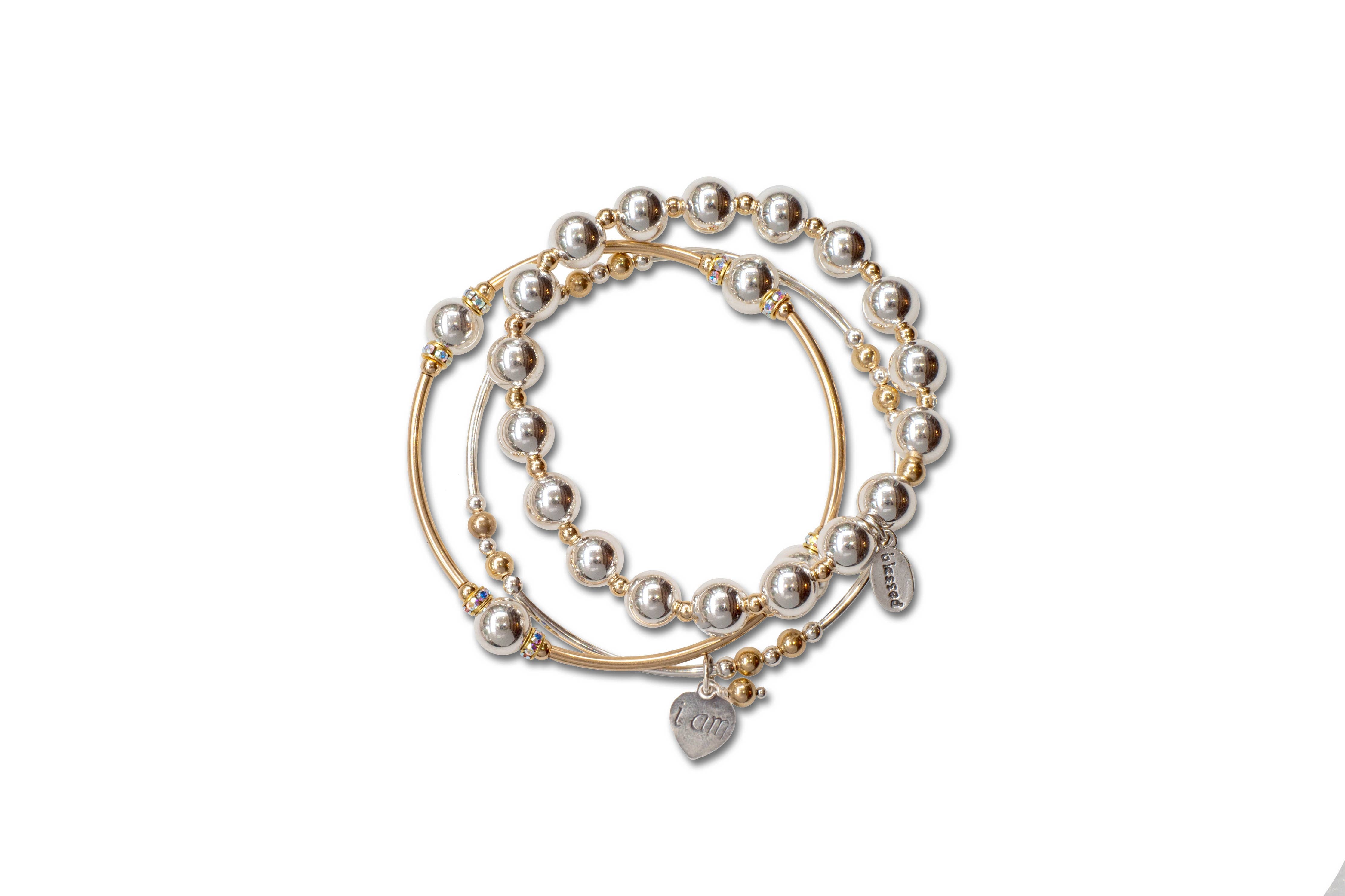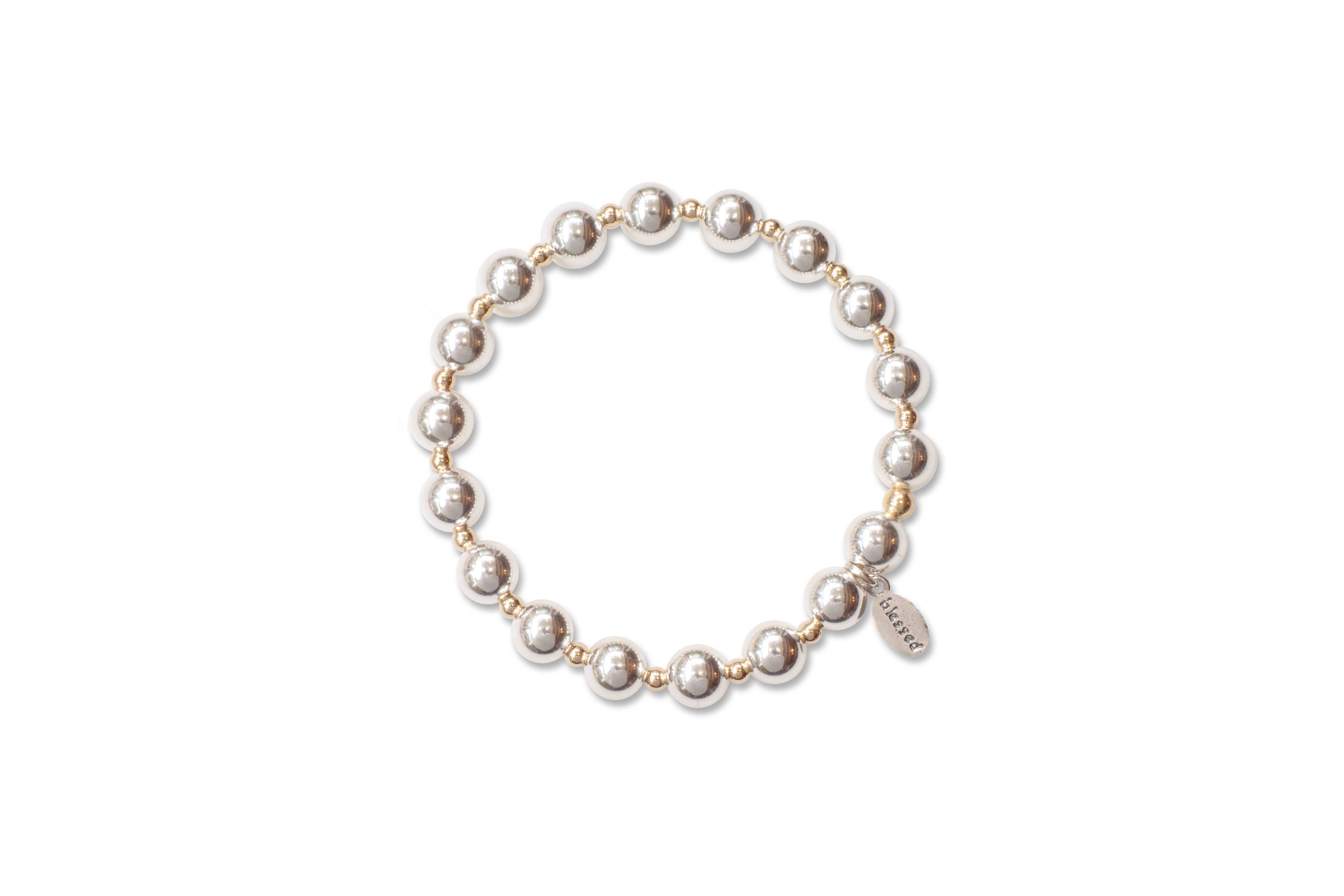 A natural compliment to the original Blessing Bracelet, the Count Your Blessings bracelet is a classic design that looks elegant when worn alone, or mixed in stacks of bracelets – and is made for easy, stretchable fit of 8mm Sterling silver beads and a "Blessed" charm, with 3mm gold-filled accent beads.