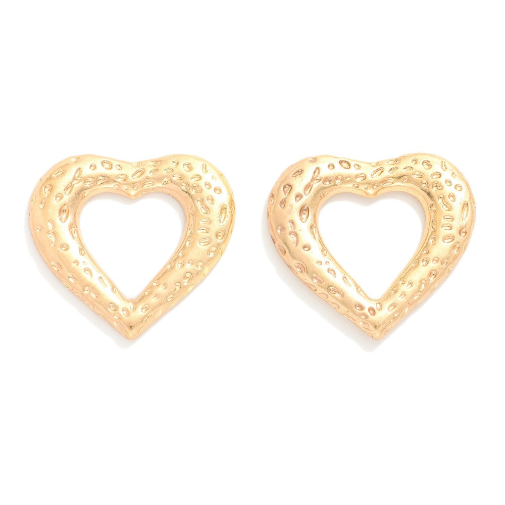 Indulge in the luxurious and delicate beauty of our Gold Heart Textured Earrings. The textured metal adds a unique touch to the classic hoop design, creating an elegant and eye-catching accessory. At just 1" in length, these hollow drop earrings strike the perfect balance between statement and simplicity. Elevate your style with these stunning earrings that are sure to turn heads.