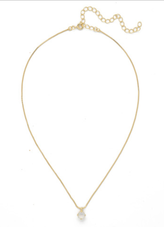 The Aria Studded Pendant Necklace features a single small round cut crystal dangling from a delicate chain, secured with a spring ring clasp.