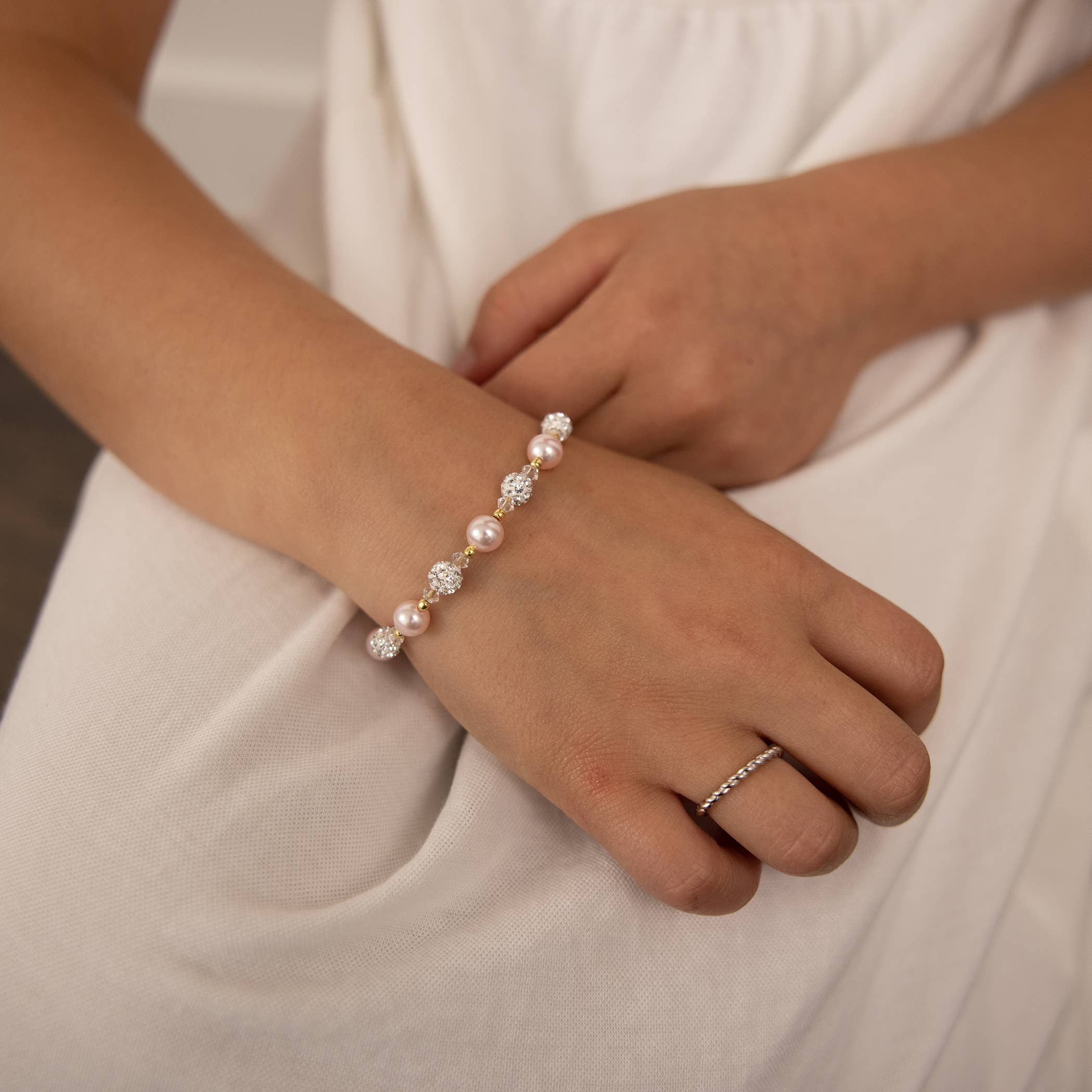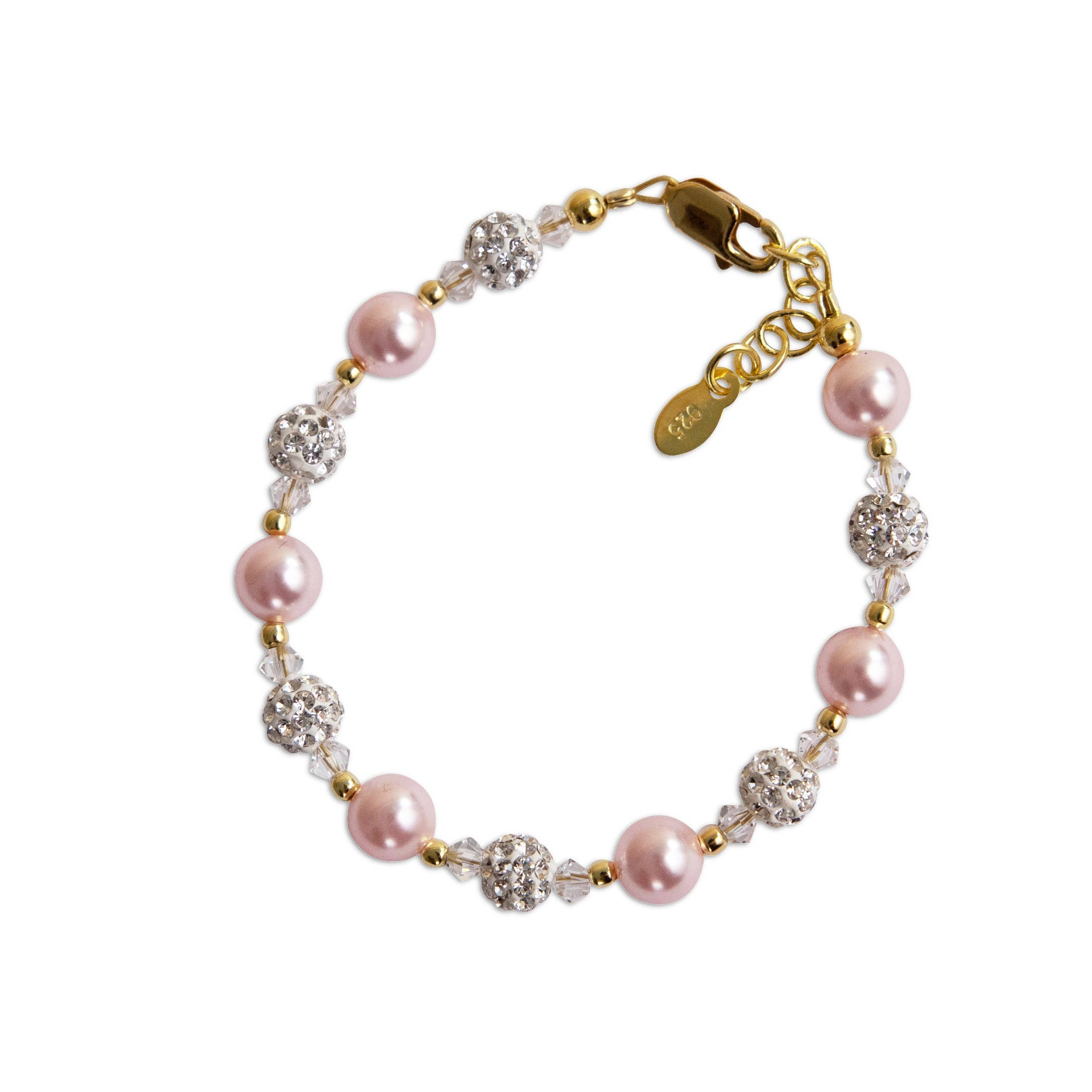 This keepsake bracelet is made with high-end pink pearls and crystals, sparkling pave beads, and 14K Gold-plated beads! This is a high quality bracelet in sterling silver with 14K gold plating. Each bracelet has an extension chain, so as the child grows you just move to the next link for a perfect fit. This bracelet is available in three sizes and is great for infants, babies, toddlers, and kids. This bracelet comes in a beautiful gift box. Hand made in the USA!
