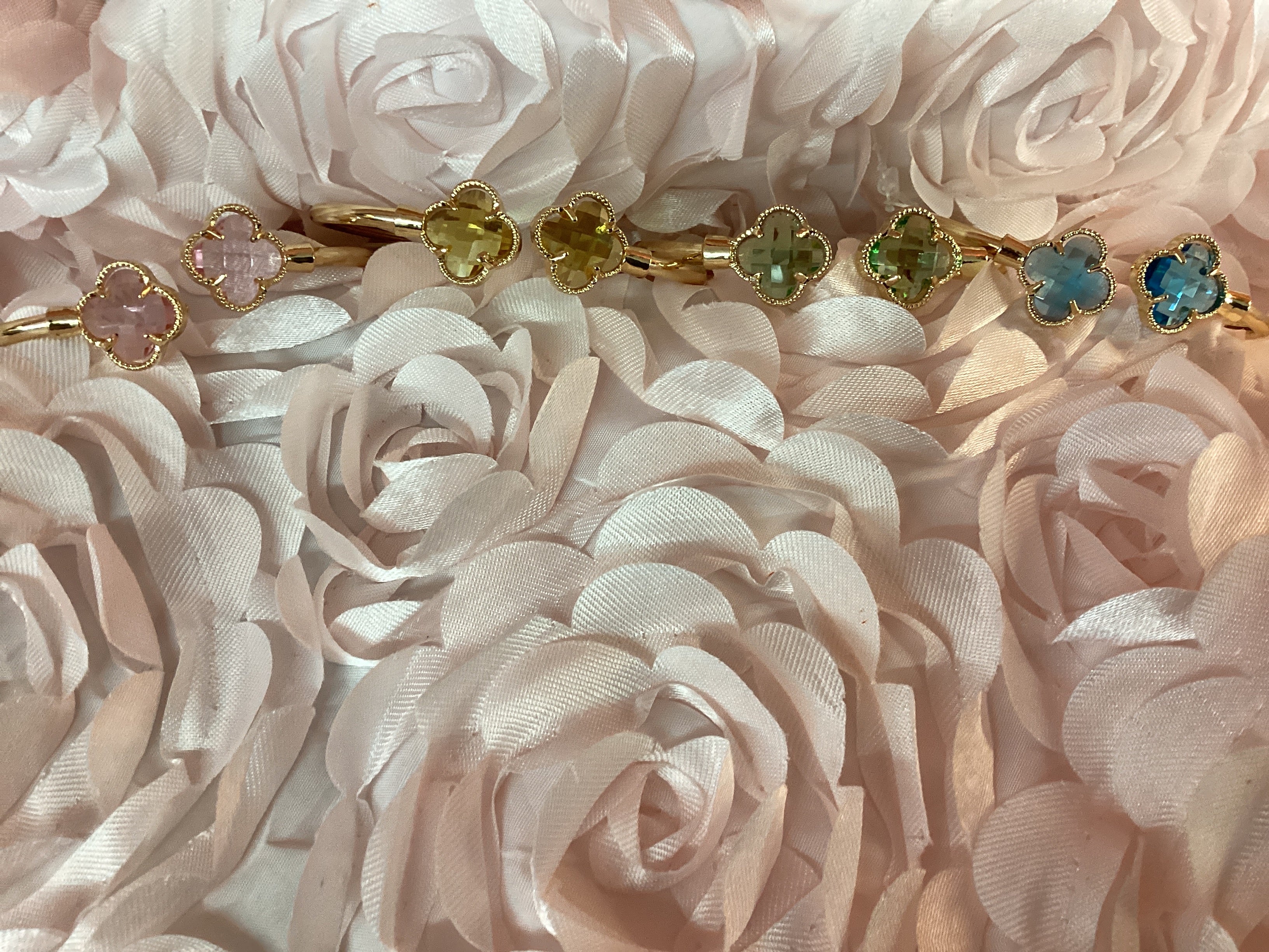 Metal Tone Bangle Bracelet Featuring a Clover Green Aqua Pink