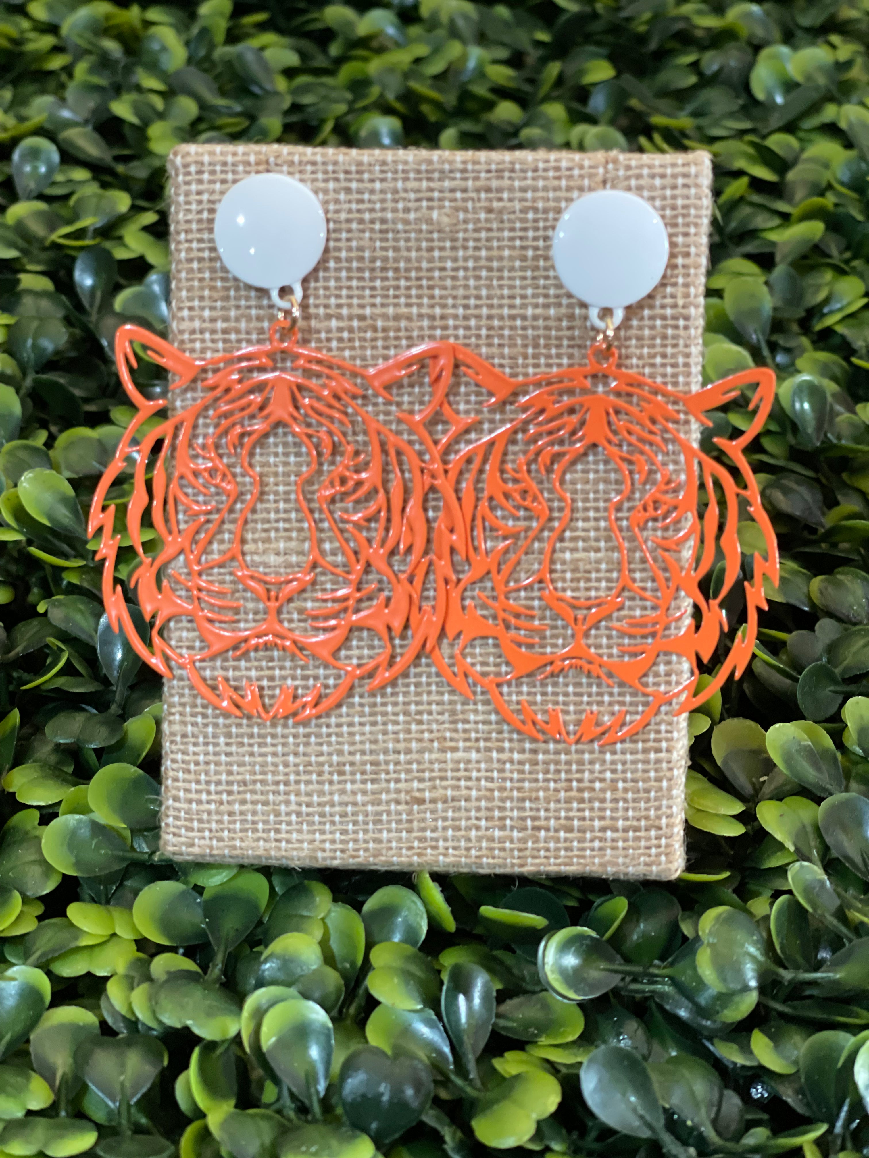 Show off your love for Alabama with our State Tiger Filigree Earrings! Featuring a fierce tiger design in orange with a navy accent on a post, these earrings add a unique and stylish touch to any outfit. Show your state pride and make a statement with these earrings.