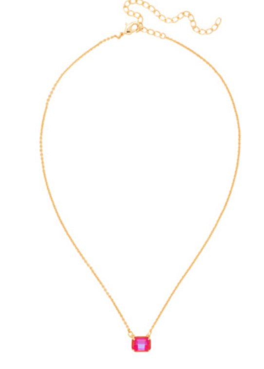 The Octavia Single Crystal Pendant Necklace features a single horizontal emerald-cut crystal on an adjustable chain, secured with a lobster claw clasp.
