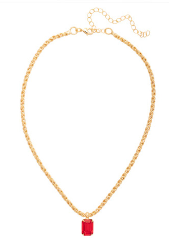 The Emerald Rope Chain Pendant Necklace features an emerald cut pendant on an adjustable rope chain, secured by a lobster claw clasp.