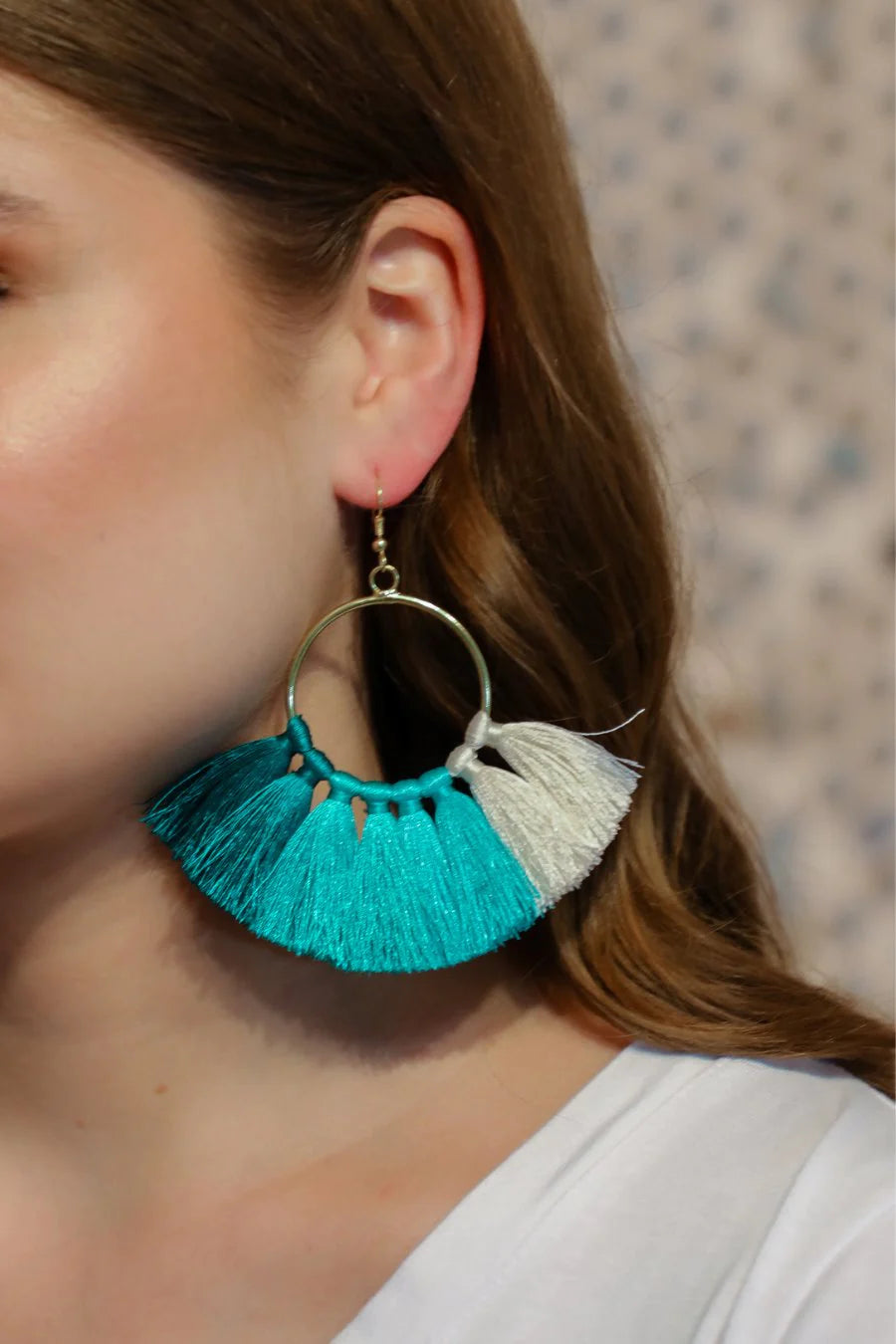 People are sure to take notes of how to achieve your amazing style when you complete your look with these earrings featuring gold hoops with blue hue colored tassel fans!