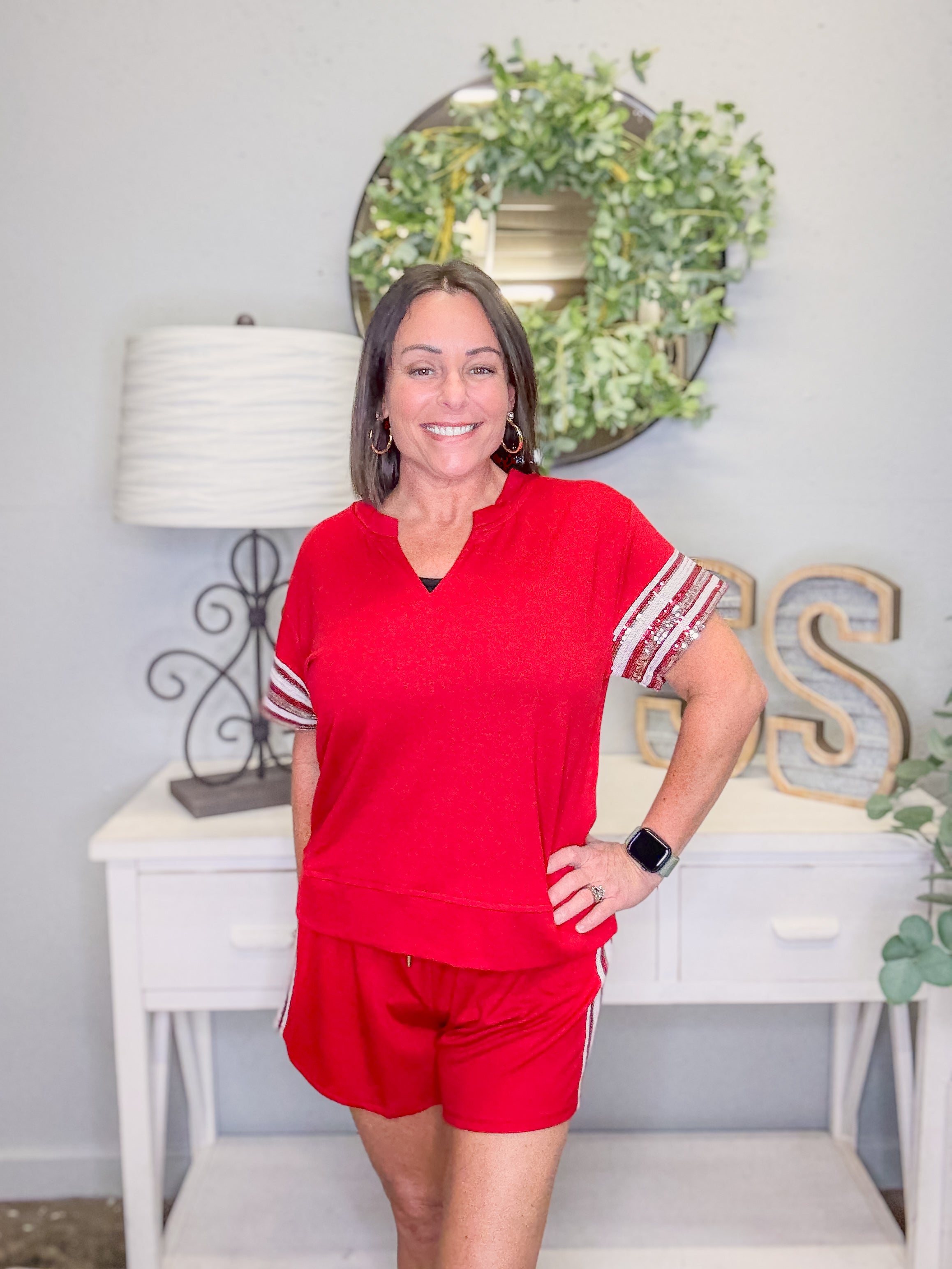Show off your Alabama pride with the ultimate game day set that’s equal parts comfy and fabulous! This bold crimson red matching set features a v-neck top with sequin stripes in Alabama-inspired colors — red, white, and silver — across the sleeves. The shorts bring the sparkle too, with sequin side stripes and an adjustable drawstring waistband. Whether you're heading to Bryant-Denny Stadium or hosting the ultimate watch party, this look was made for the Bama girl who loves to shine.