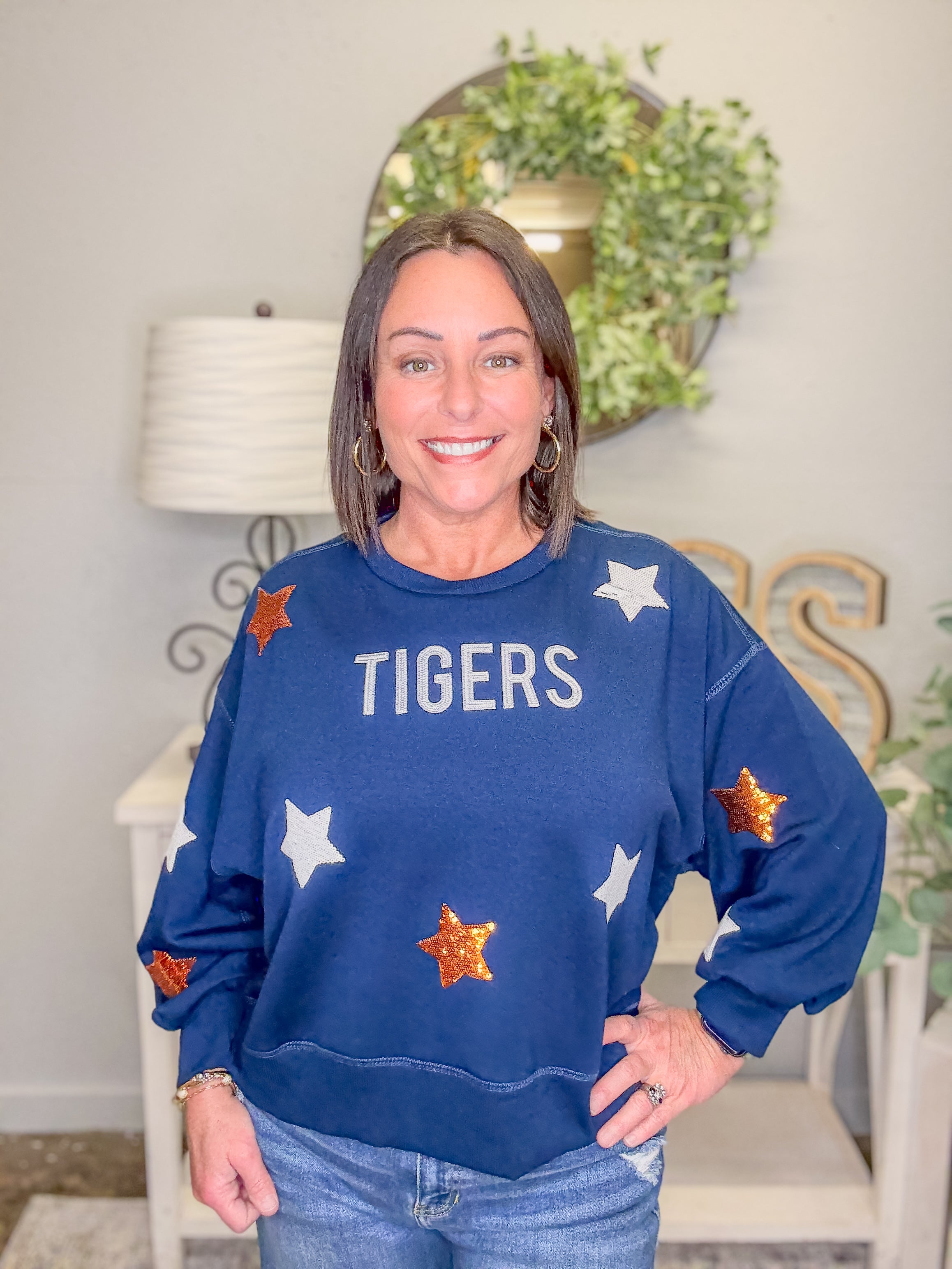 War Eagle, y’all! The best-selling Millie Sweatshirt is back, and this time it's decked out in navy with orange and white sequin stars that scream Auburn spirit! This comfy, oversized sweatshirt is the perfect way to stay cute and cozy for game day tailgates or chilly fall weekends. The white “TIGERS” script on the chest adds the perfect classic touch, while the playful stars bring all the sparkle!