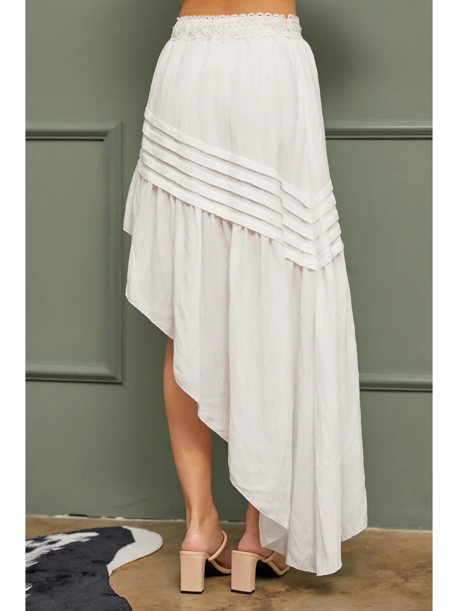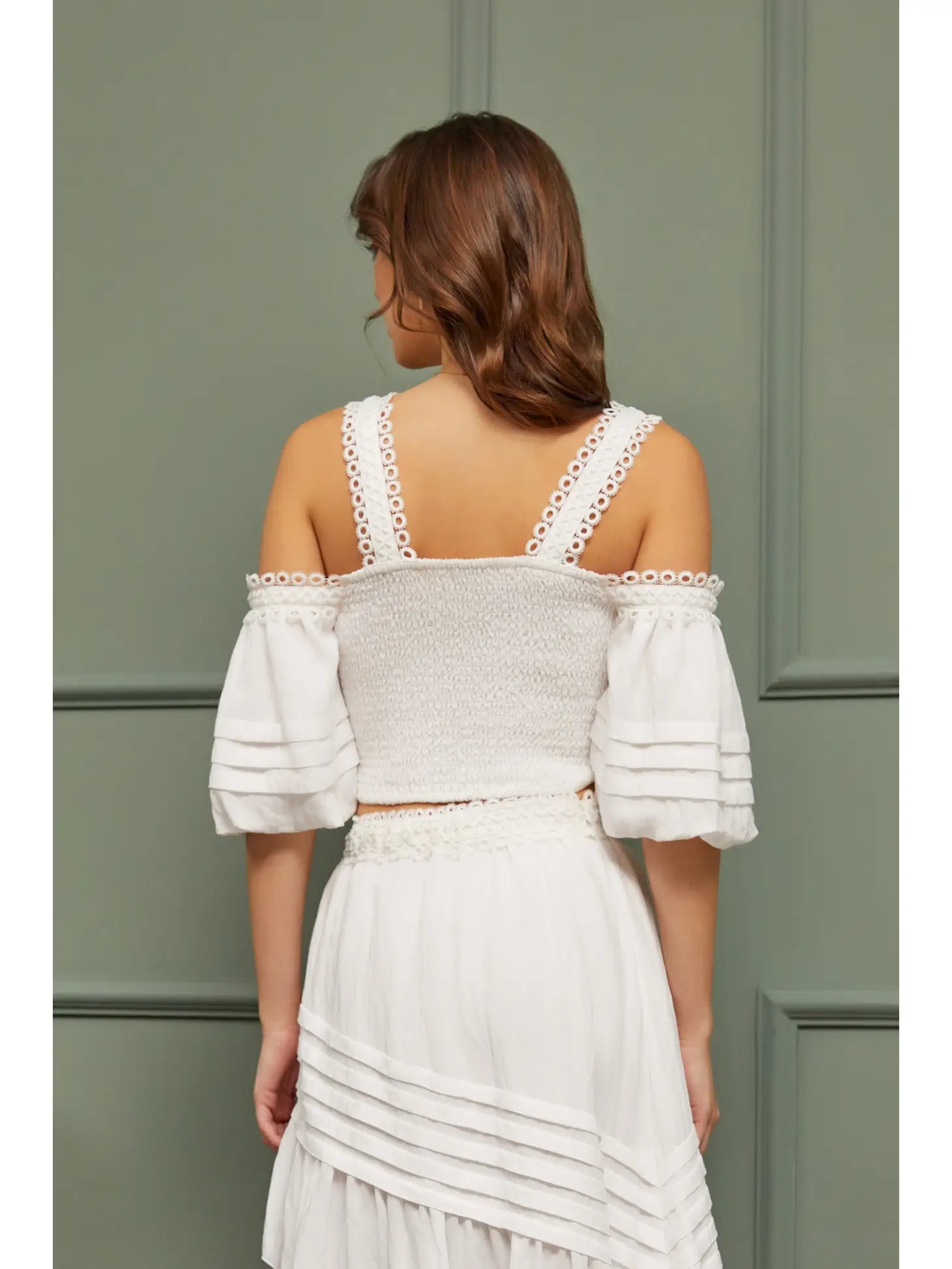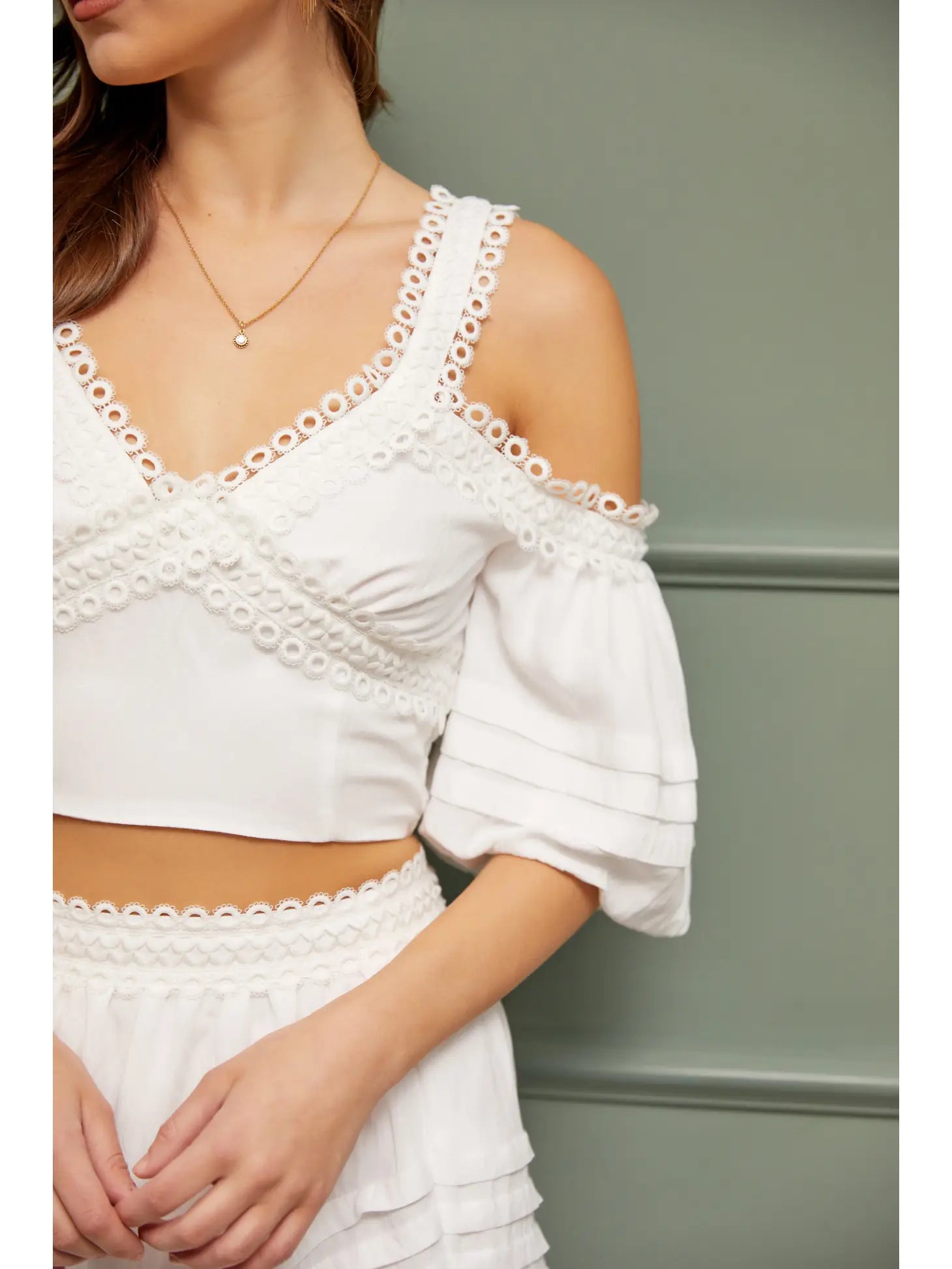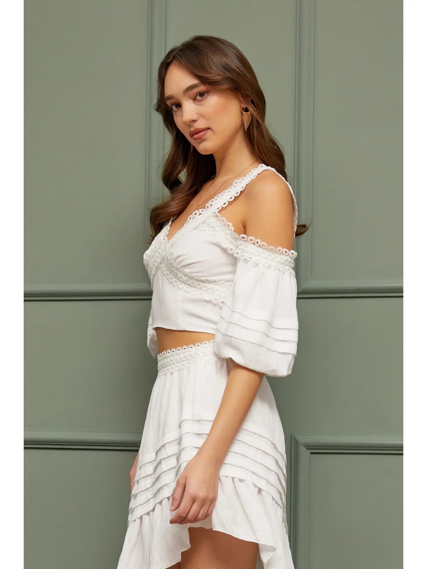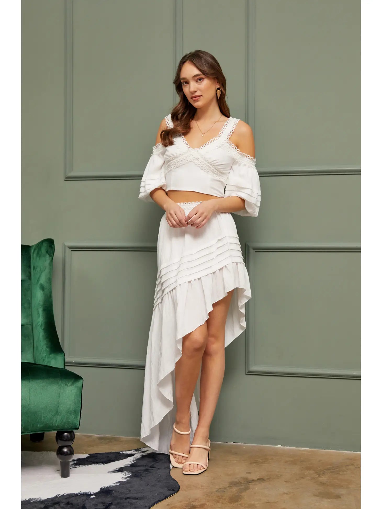 The Ruffled Fling makes a statement with its unique cold shoulder trim detail crop top coupled with a side ruffle skirt. Its striking combination of fashion and functionality are perfect for the beach and summer pictures. Available in white and sizes Small-Large.